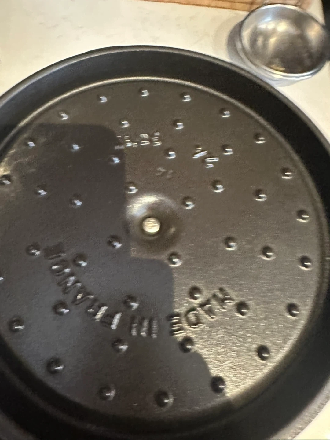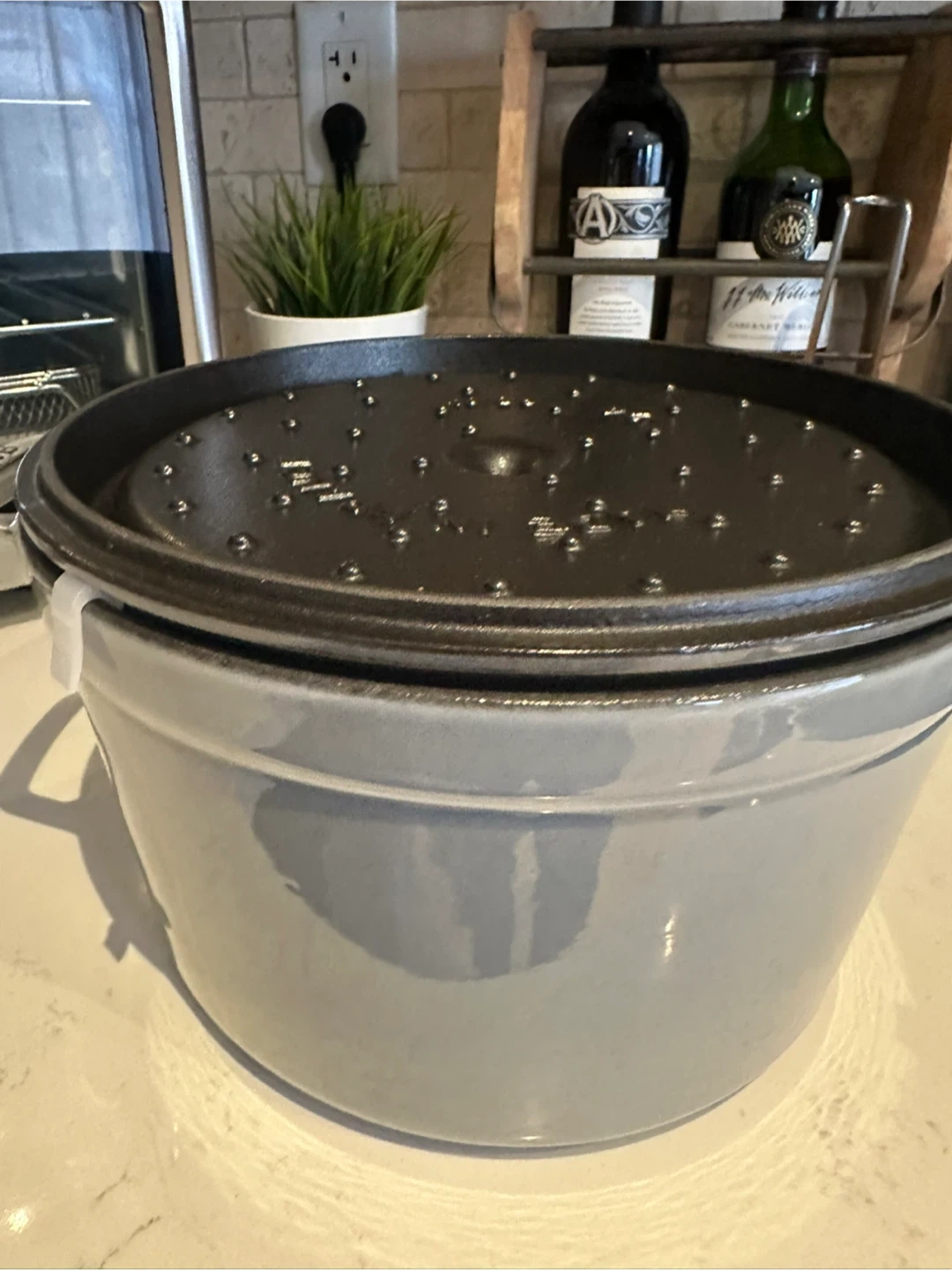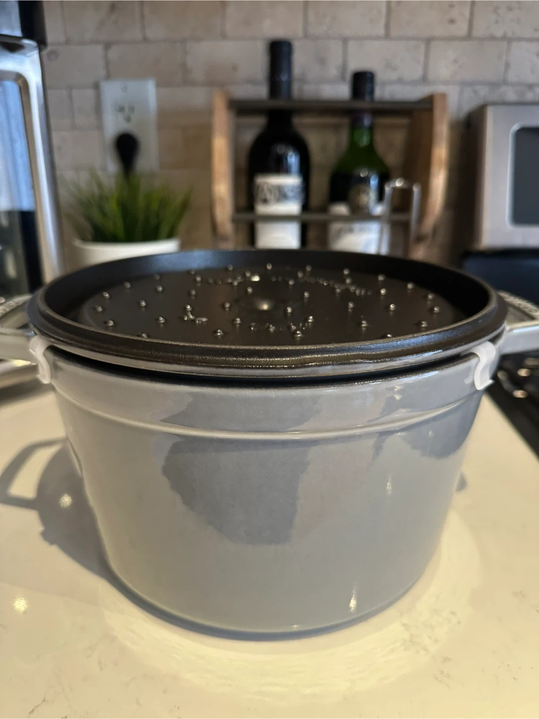 Heavy weight, tight-fitting lid retains moisture, spikes on the lid create a rain-forest effect evenly returning juices back onto food