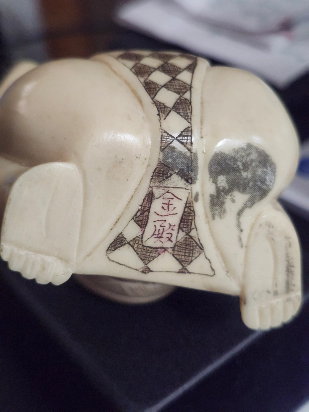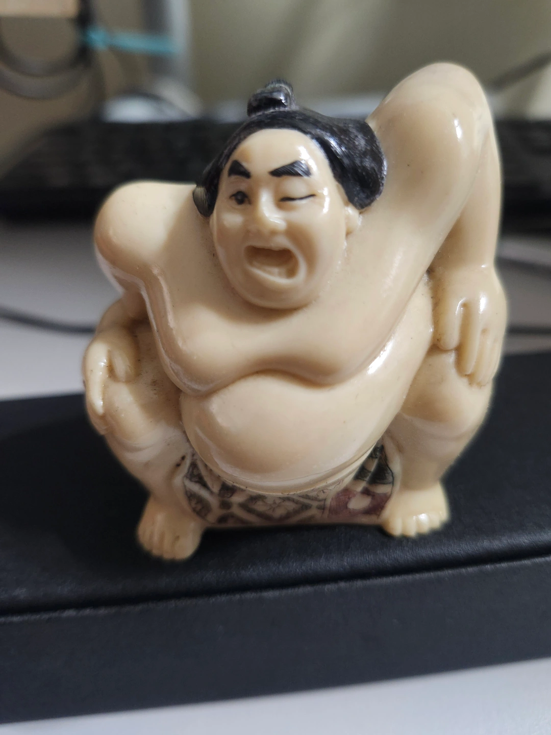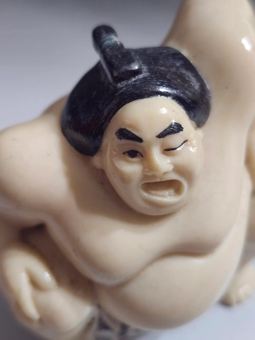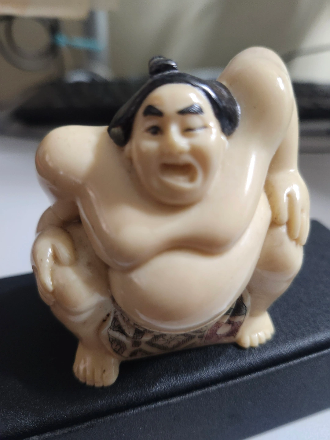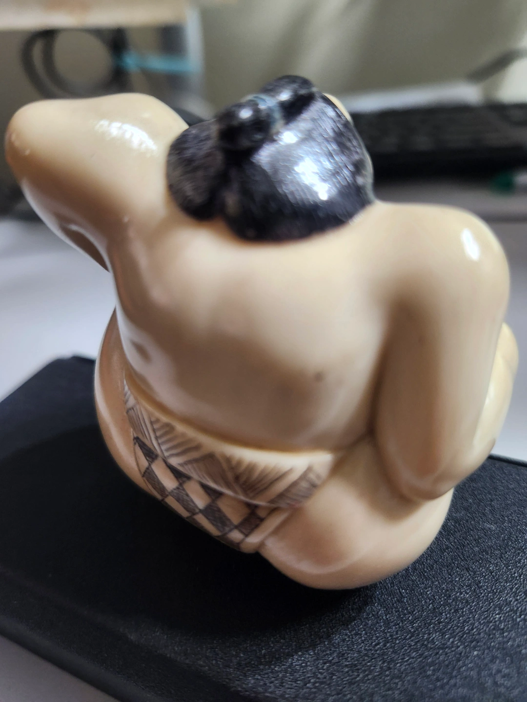 Intricately carved figurine. Depicts a sumo wrestler in a seated position. Features detailed facial expressions and clothing. Small in size, perfect for collectors or enthusiasts.