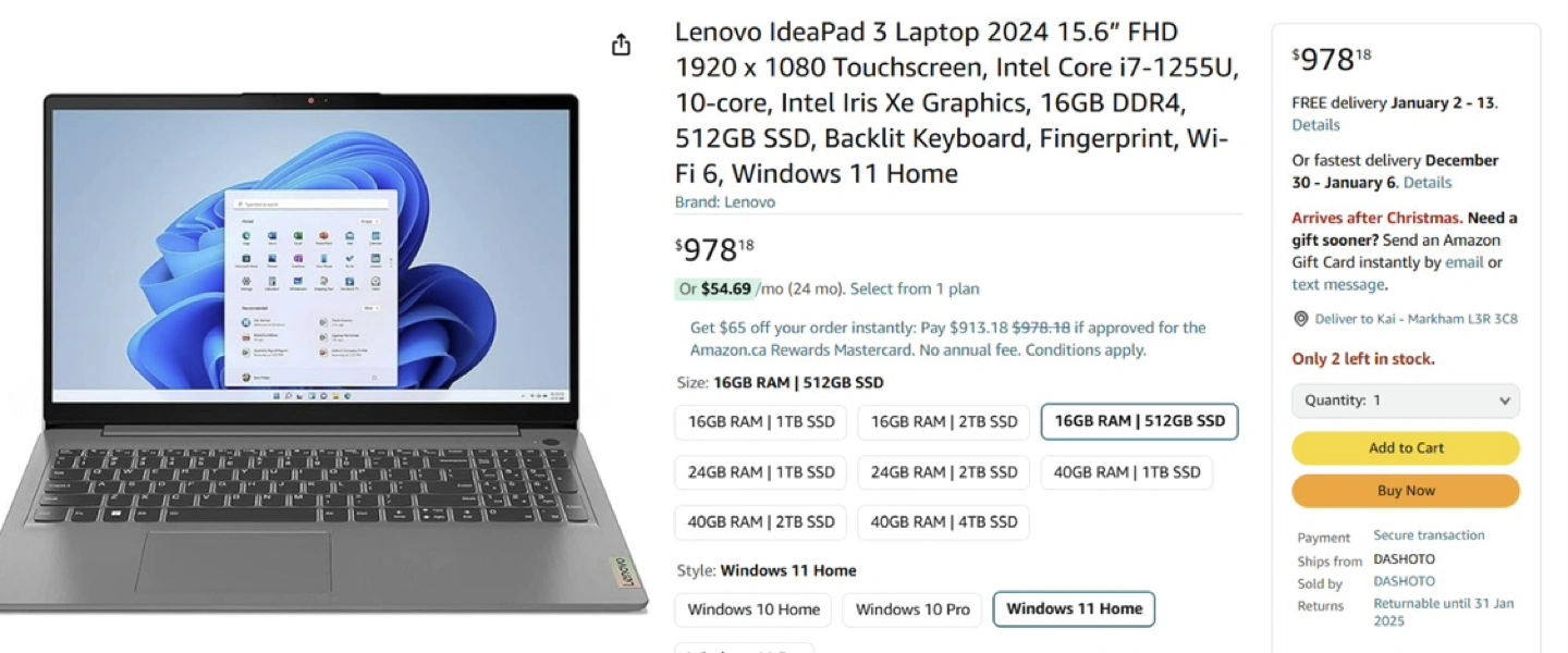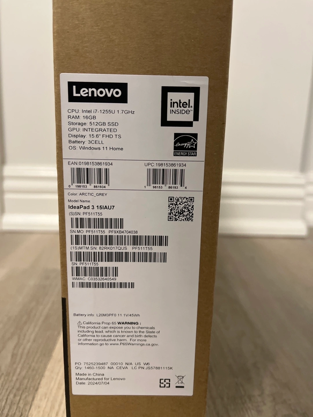 unopened Lenovo IdeaPad 3 laptop. 15.6-inch FHD touchscreen display. Intel Core i7-1255U processor. 16GB DDR4 RAM. 512GB SSD storage. Backlit keyboard. Fingerprint reader. Wi-Fi 6. Windows 11 Home operating system. Arctic Grey colour.