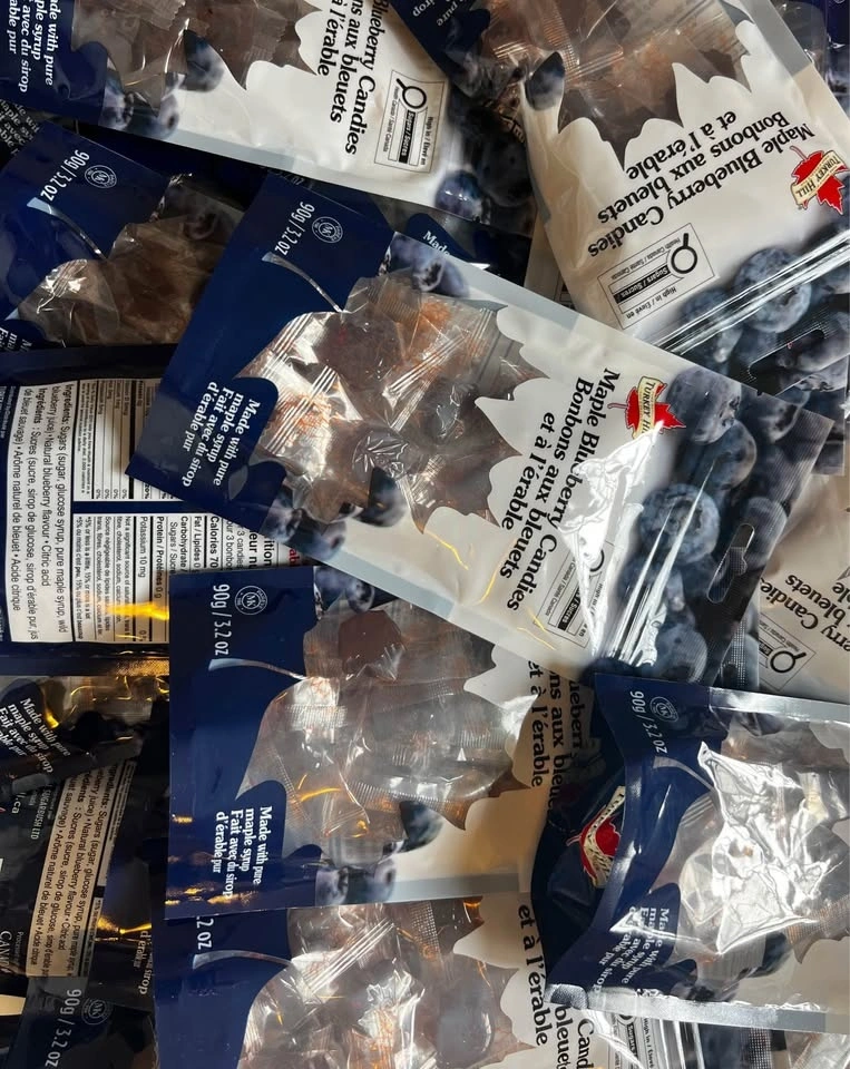Sealed bags of individually wrapped Turkey Hill Maple Blueberry hard candy. 90g per bag.