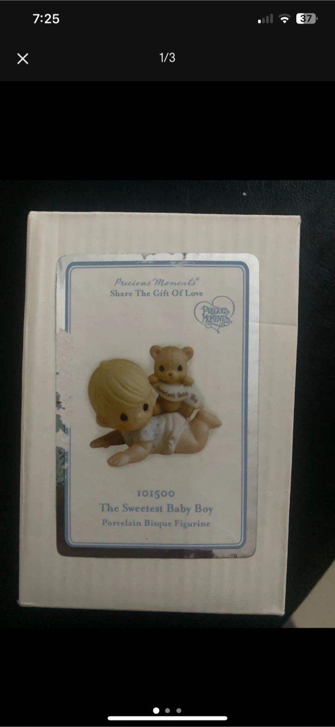 This Precious Moments "The Sweetest Baby Boy" figurine is a "Porcelain Bisque Figurine". It comes in its original box.