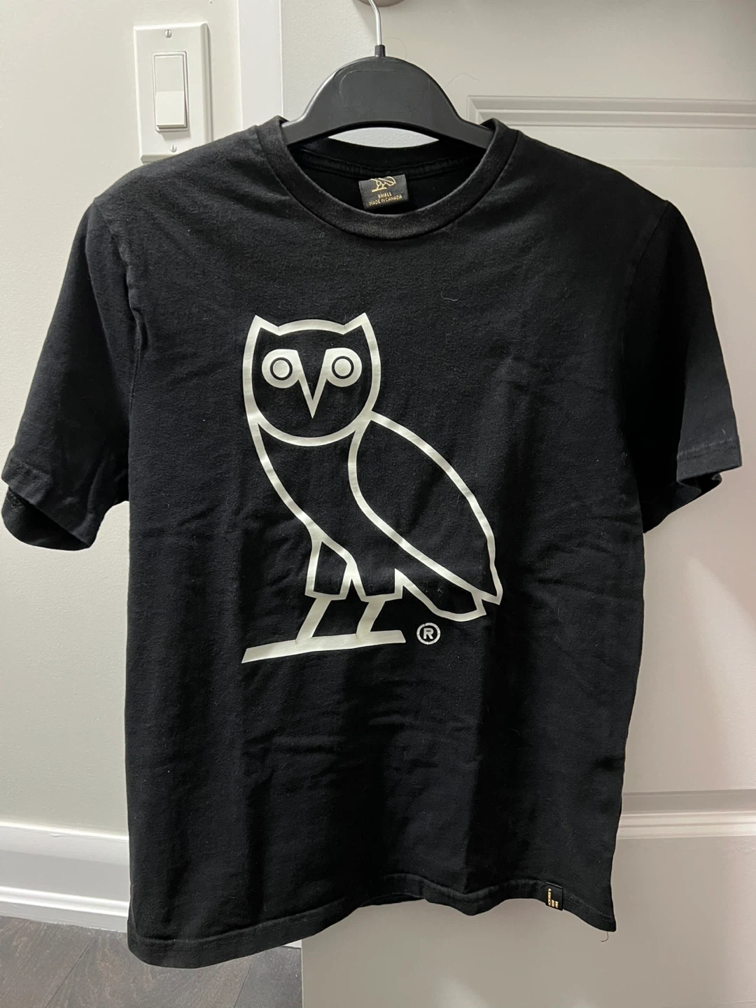 Black OVO t-shirt with the iconic owl logo. Size small and made in Canada. Cotton material.