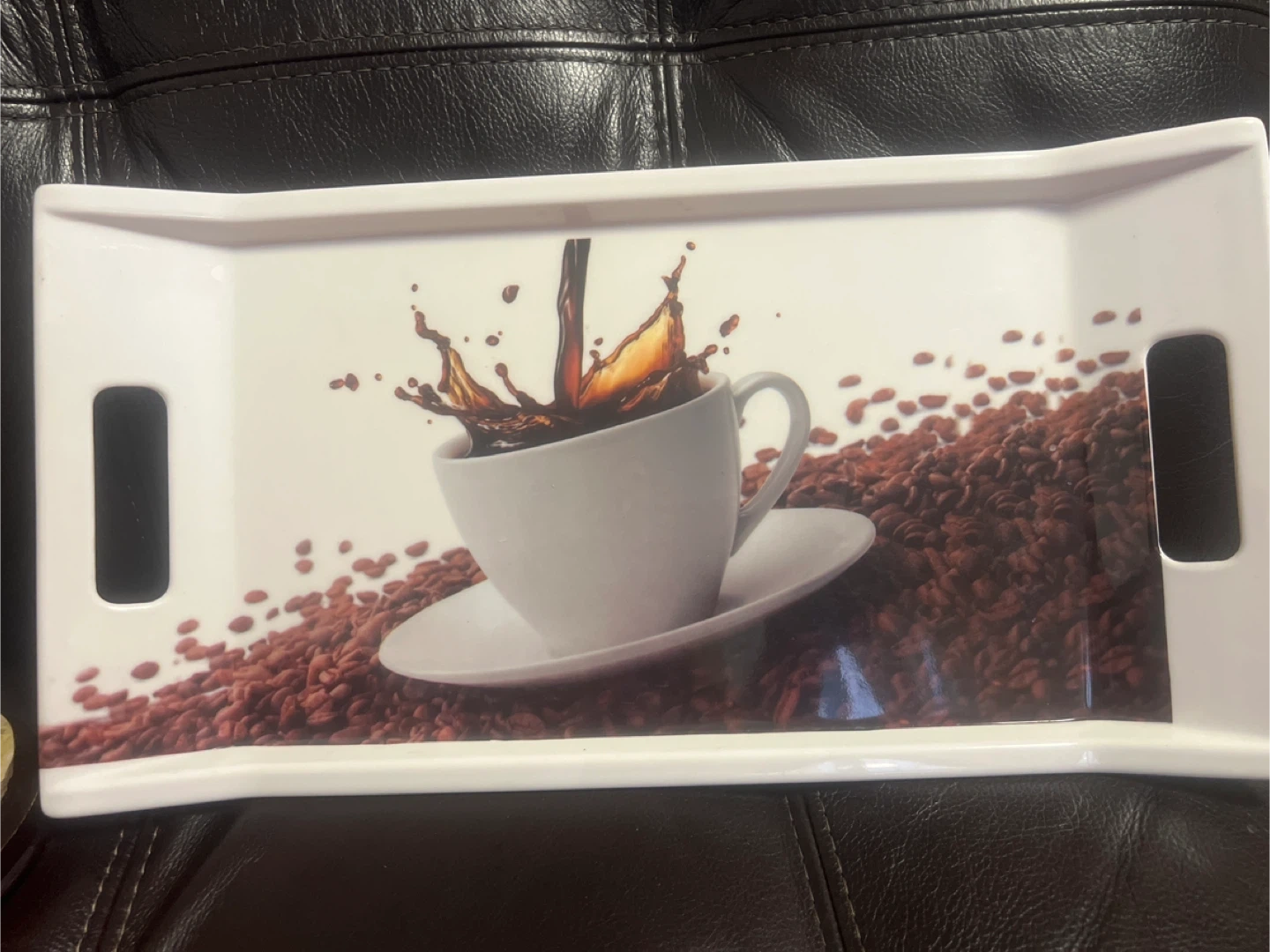 Selling a cute serving tray with a coffee bean design. It features a white background with a coffee cup and coffee bean graphics. Perfect for serving drinks or snacks!