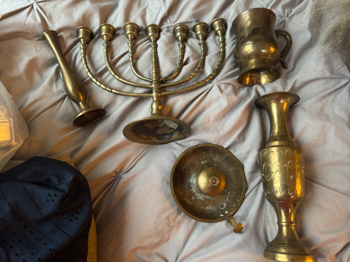 This set includes a brass menorah, two decorative vases, and a brass pitcher. The items appear to be made of brass. This collection would be lovely for home décor or special occasions.