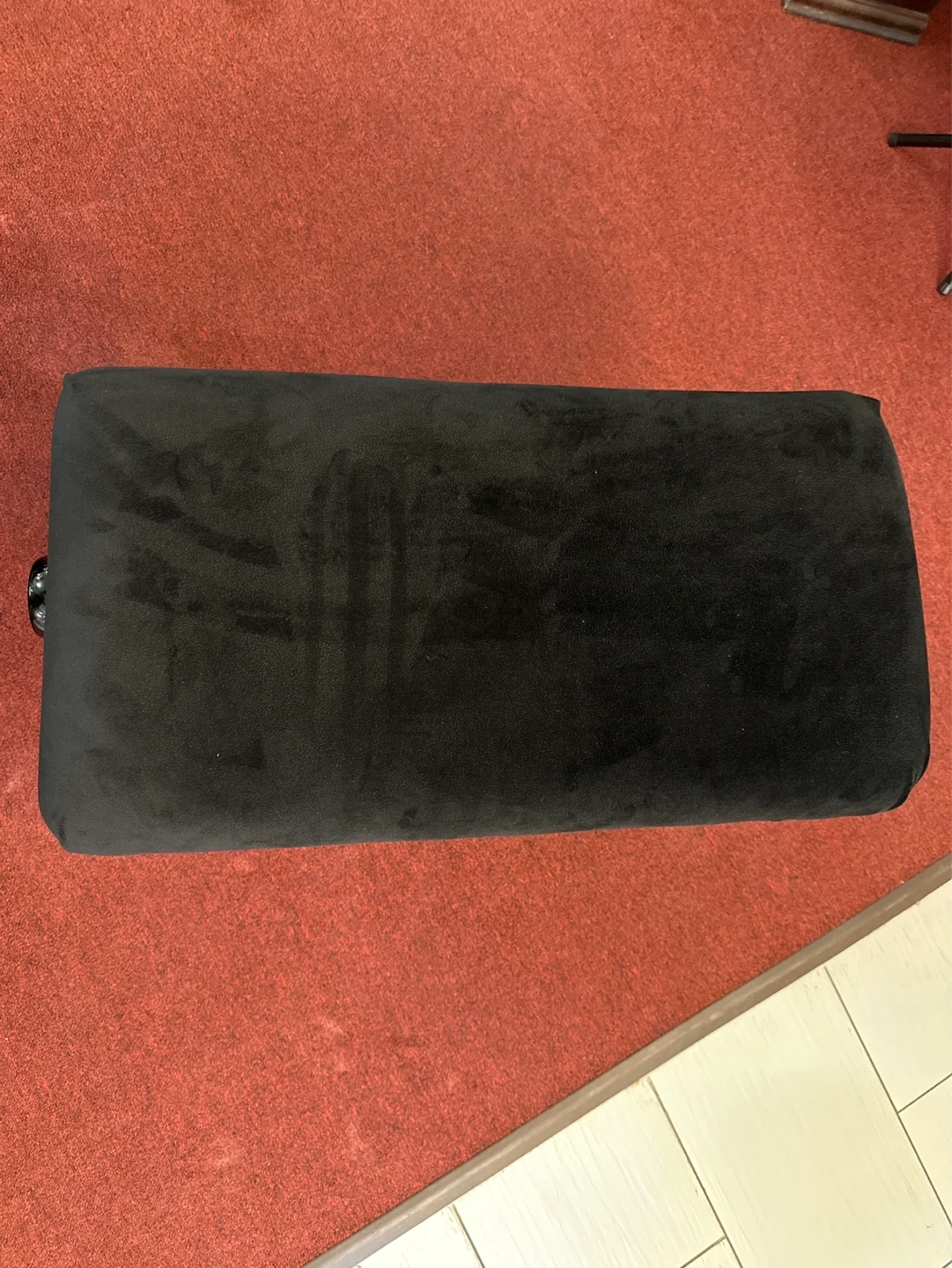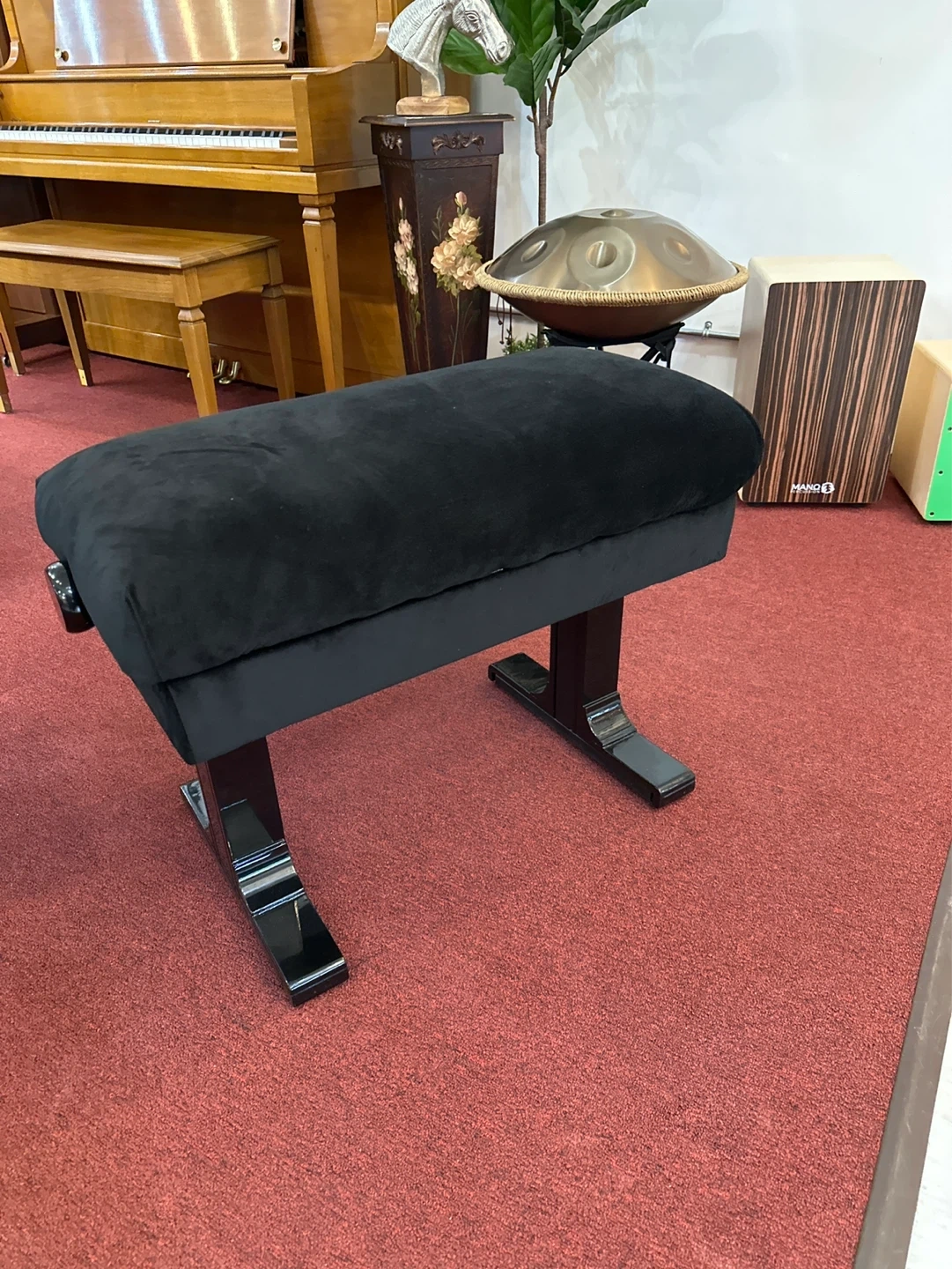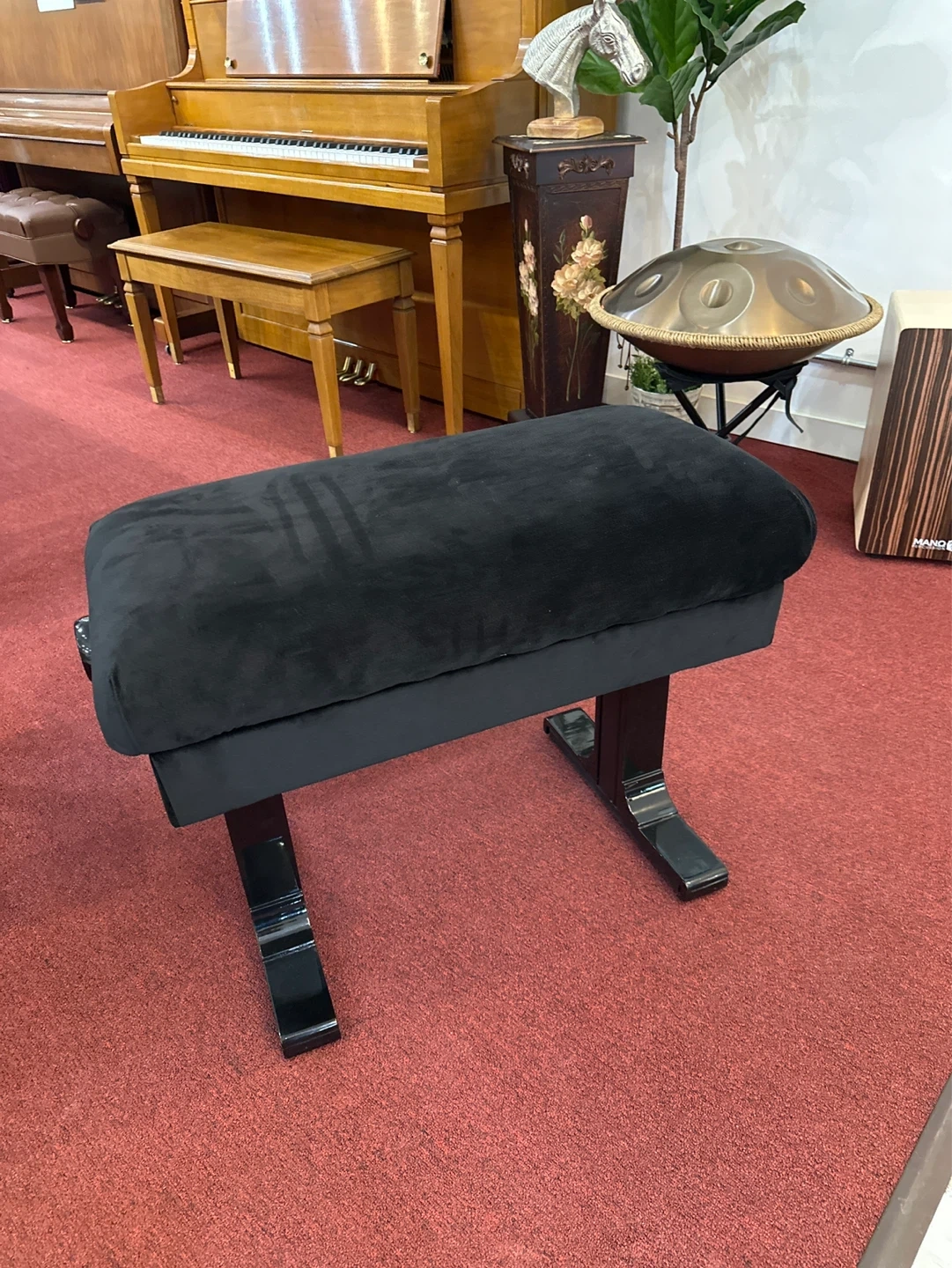 This lightly used thick black upholstered cushion top piano bench offers adjustable height for super comfortable playing. Its sturdy dark wood base provides stable support. Perfect for pianists of all levels!
