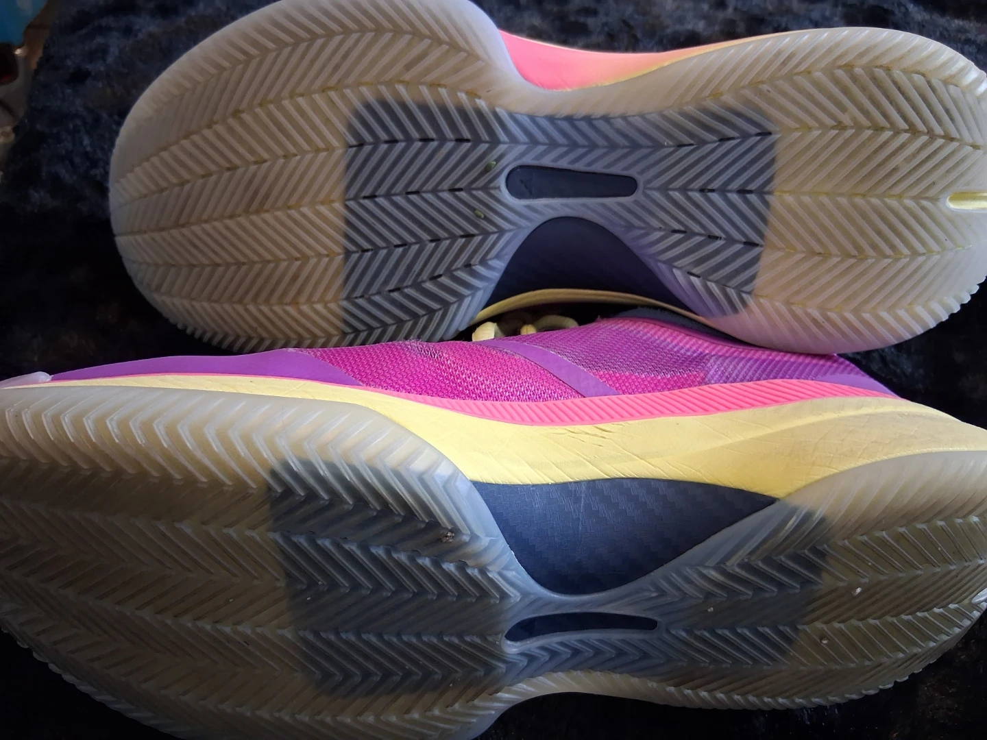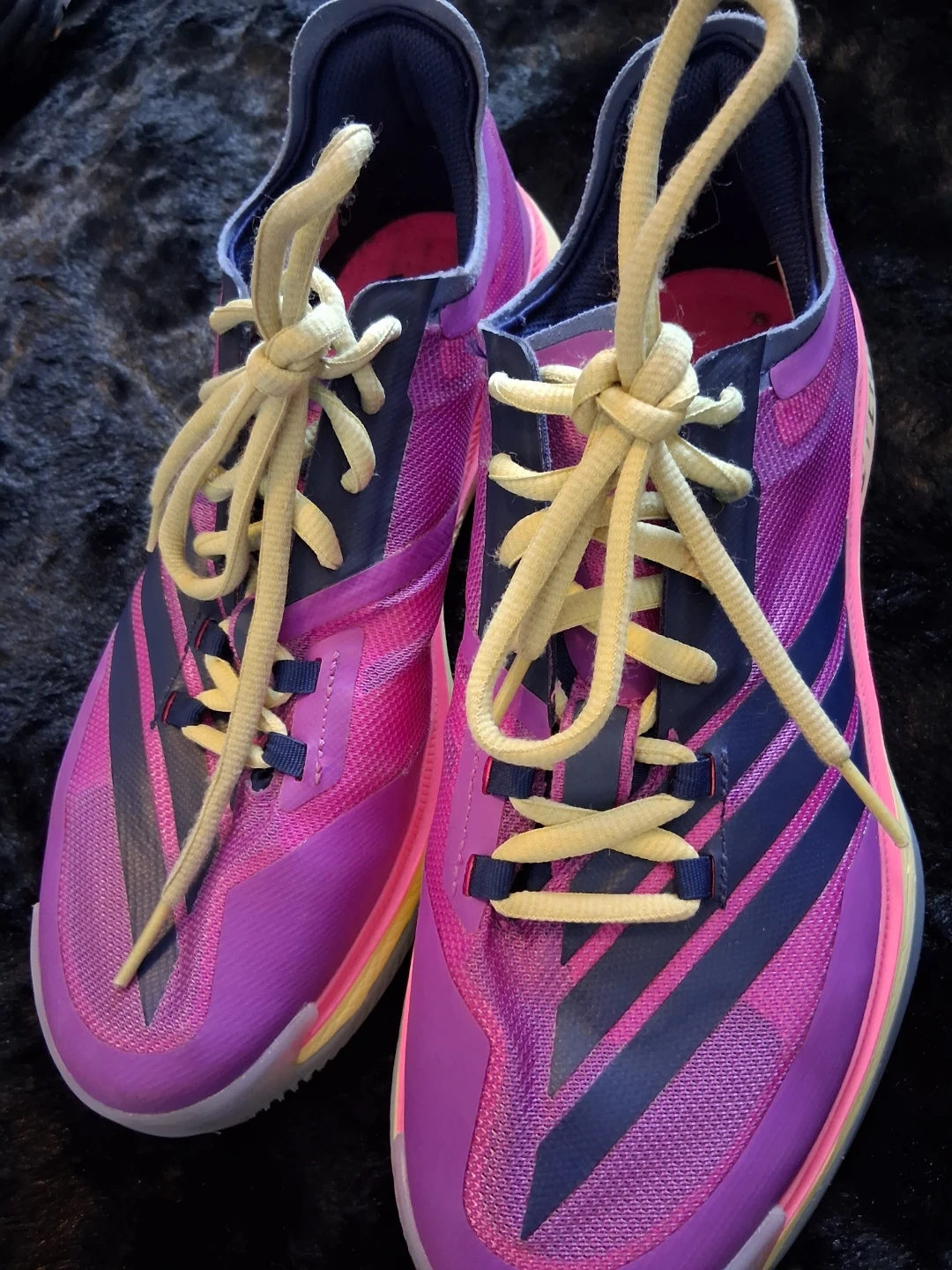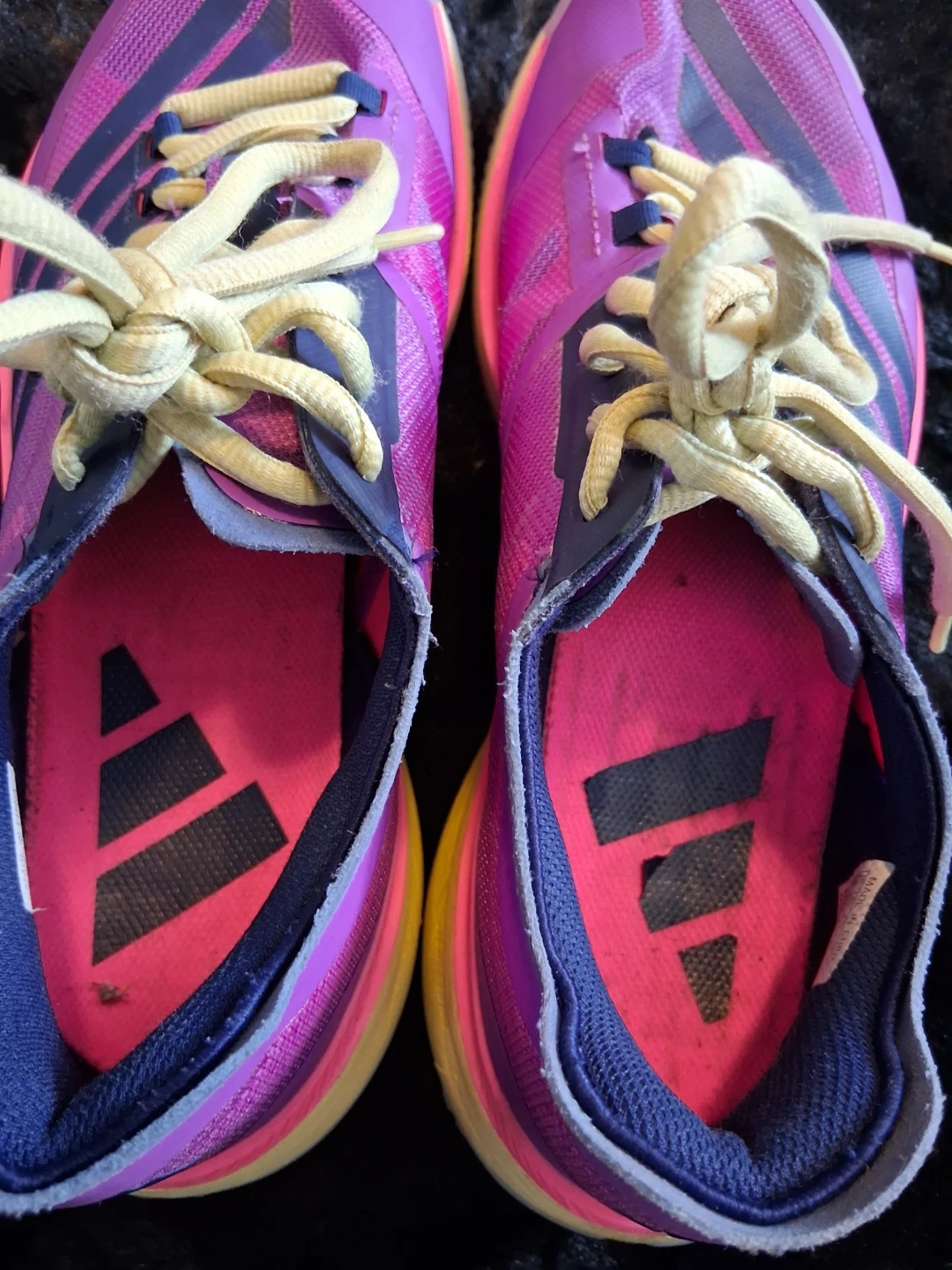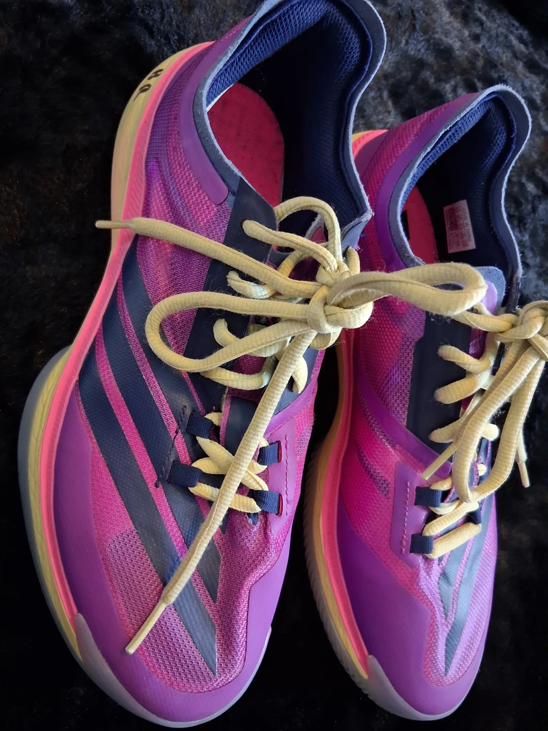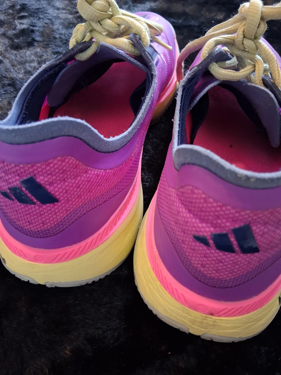 These Adidas running shoes feature a vibrant purple and pink design with navy accents. They're lightweight and built for performance. Great for your next run!