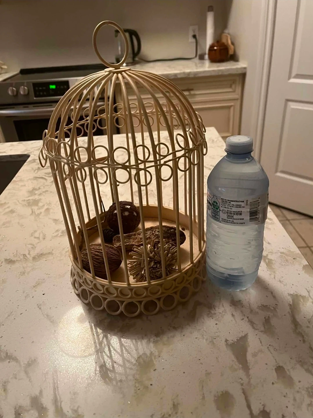This decorative bird cage is made of a light-coloured metal with intricate detailing. It's a charming piece for home decor, suitable for mantels or side tables. It would make a lovely addition to a rustic or shabby chic style setting.