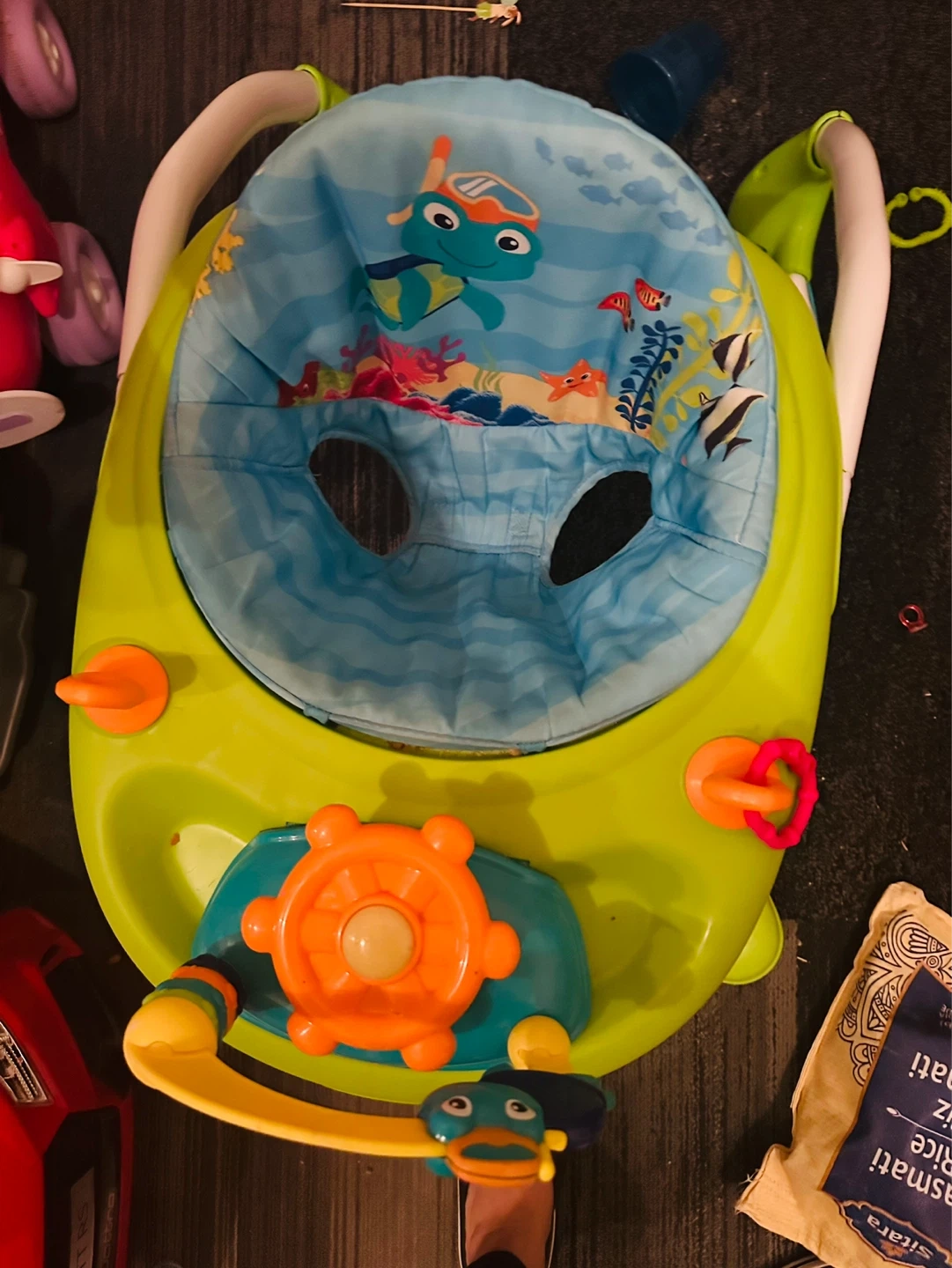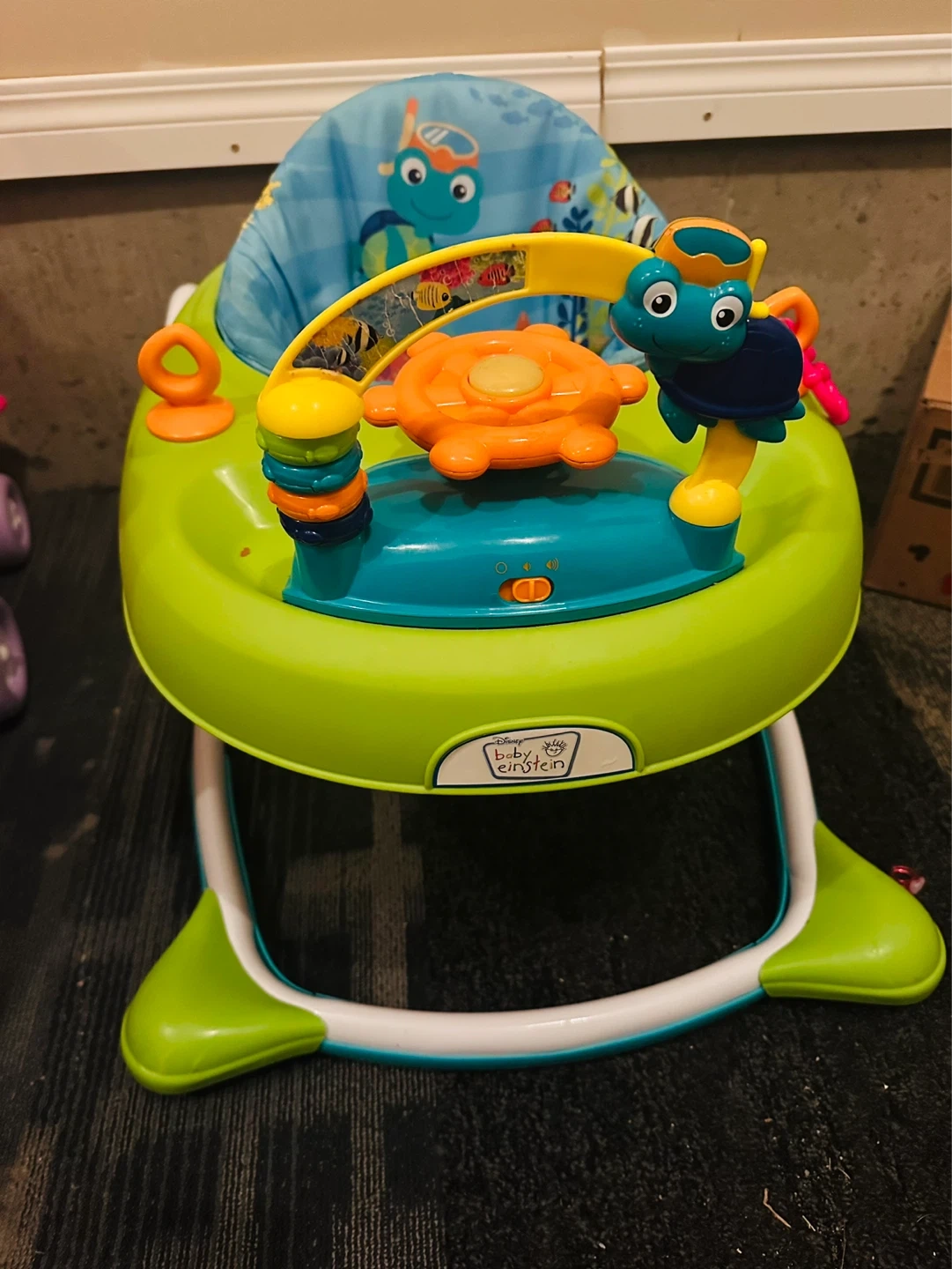 This Baby Einstein walker has an ocean theme with cute turtle characters. It's designed to help little ones explore their surroundings. The seat pad is removable for cleaning.