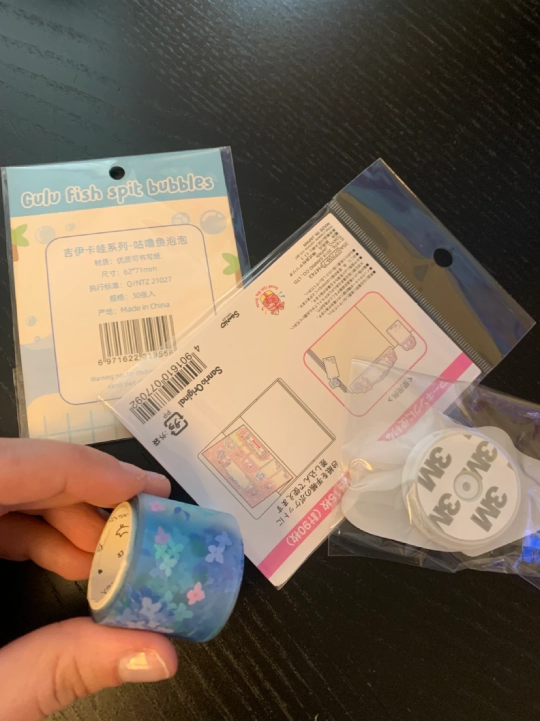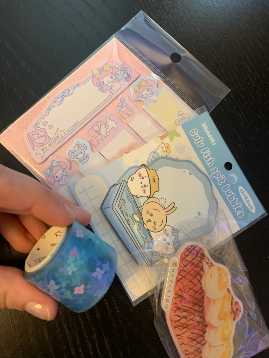 Cute stationery set featuring My Melody and chiikawa designs. Includes sticky notes and a floral washi tape and a pop socket from hazukido