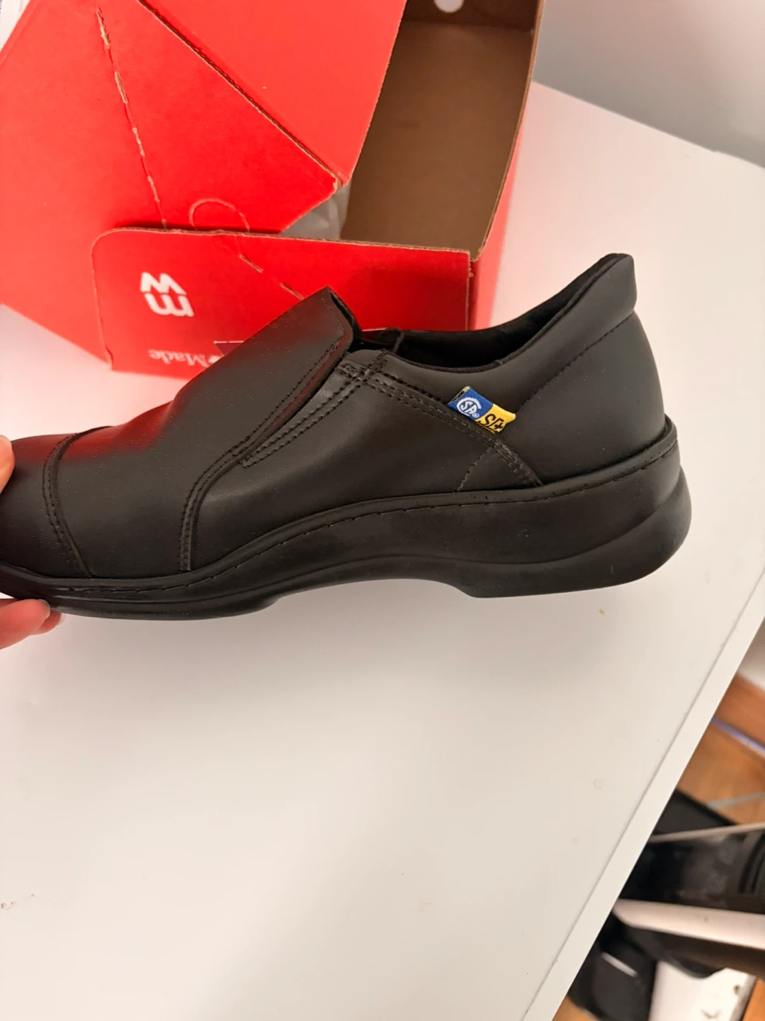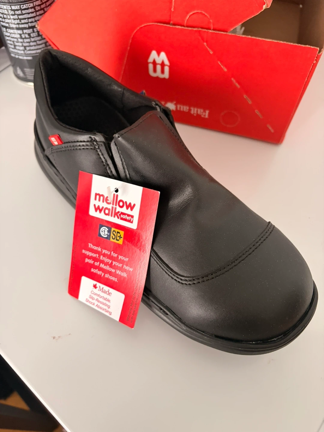 Chaussures de sécurité noires Mellow Walk, modèle Jamie. Semelle antidérapante, confortable et absorbant les chocs. Idéales pour le travail.