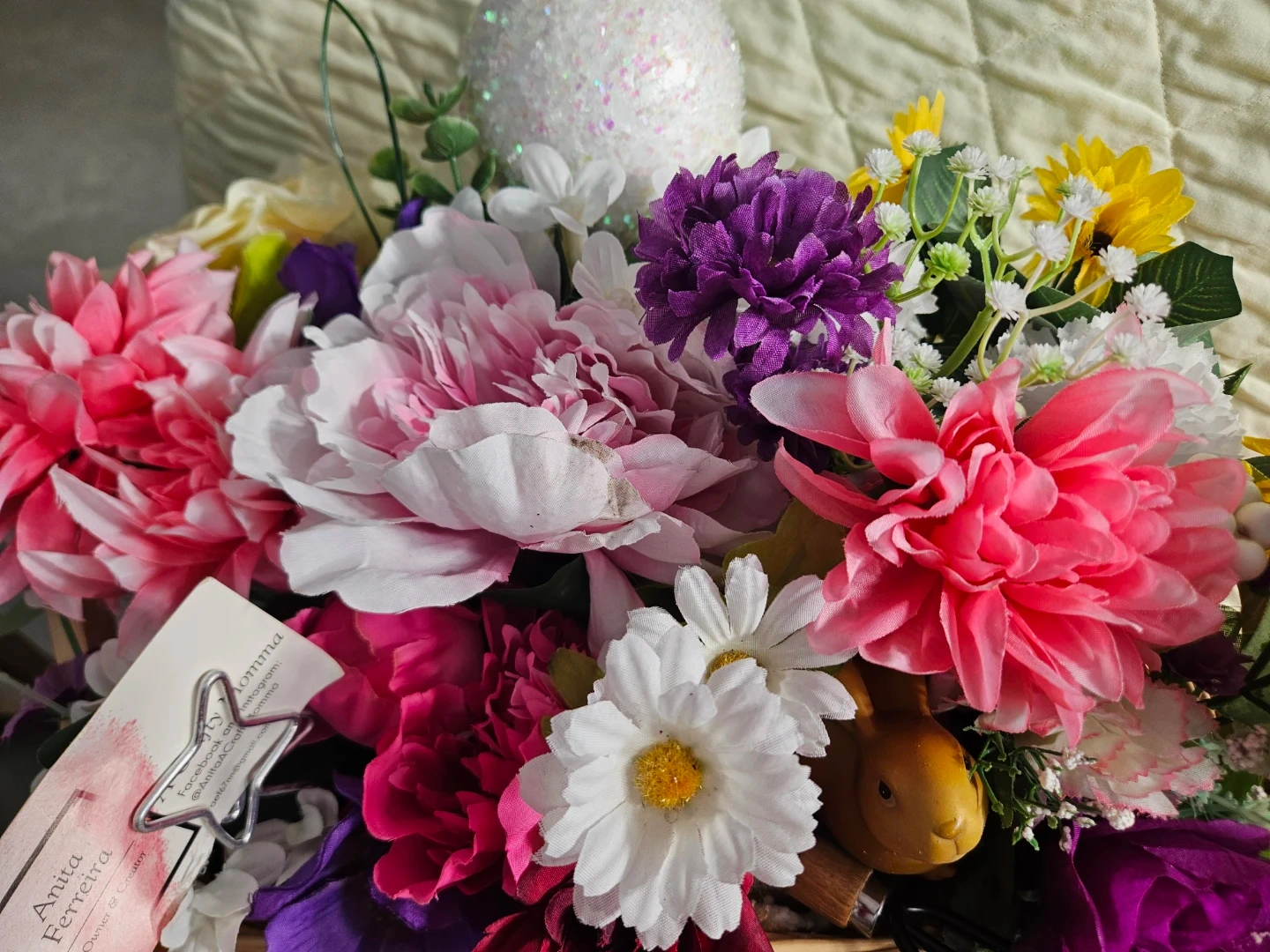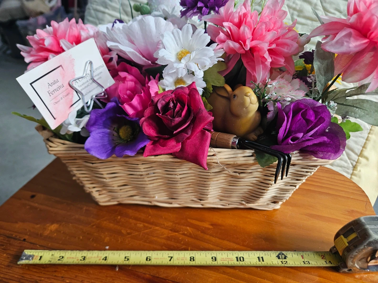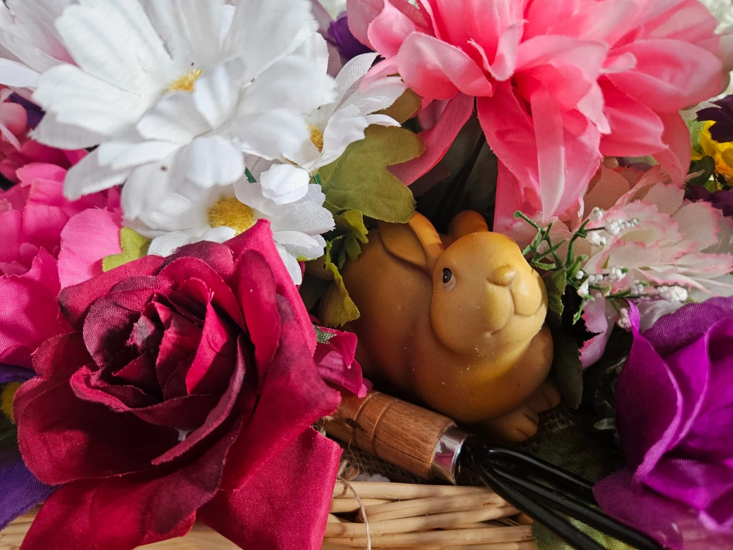 A charming Easter floral arrangement in a wicker basket, featuring a cute bunny figurine and miniature gardening tools. It's decorated with a mix of colourful artificial flowers like roses, daisies, and sunflowers, plus a sparkly Easter egg.