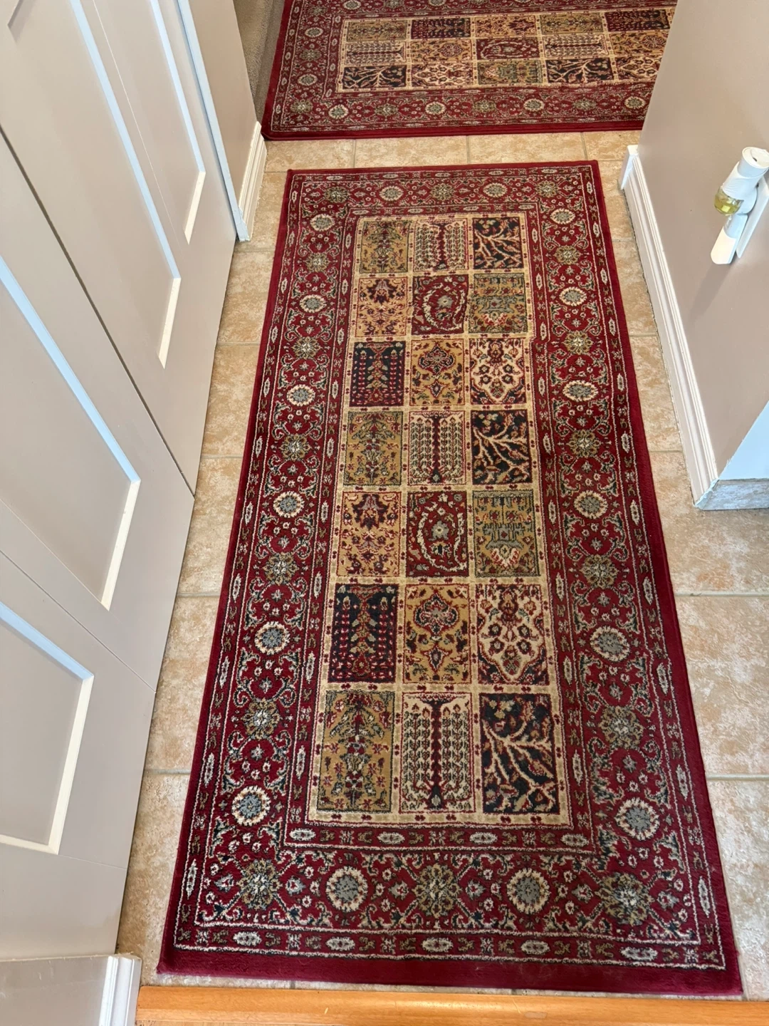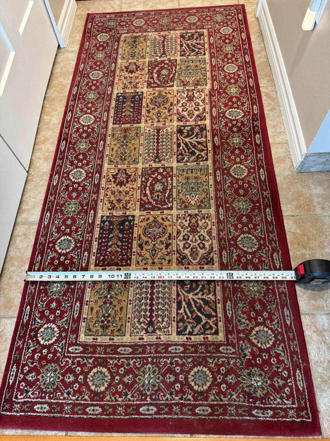 2 Red runner rugs in very good condition with a traditional Persian-inspired pattern. Features a central panel with alternating square motifs in cream, navy, and gold. Dimensions: approximately 2.5 ft wide by 6 ft long. Adds a warm touch to hallways or entryways!