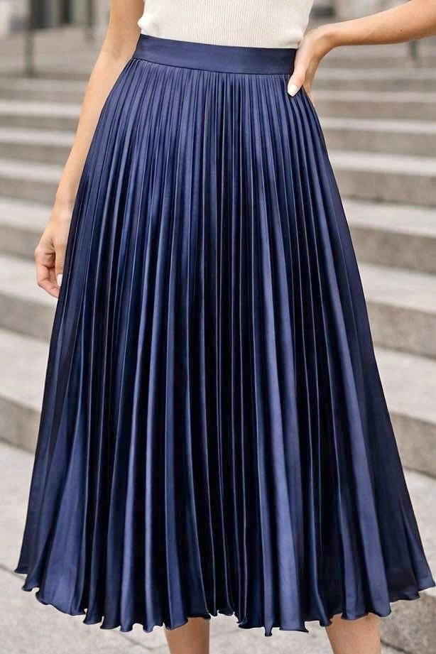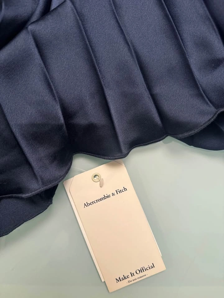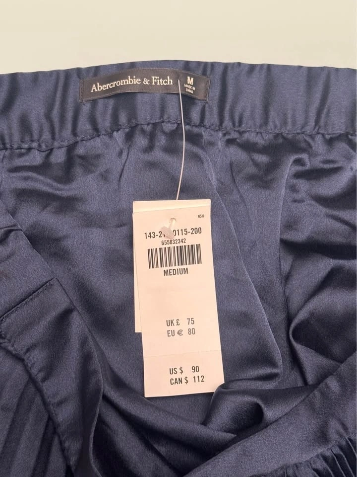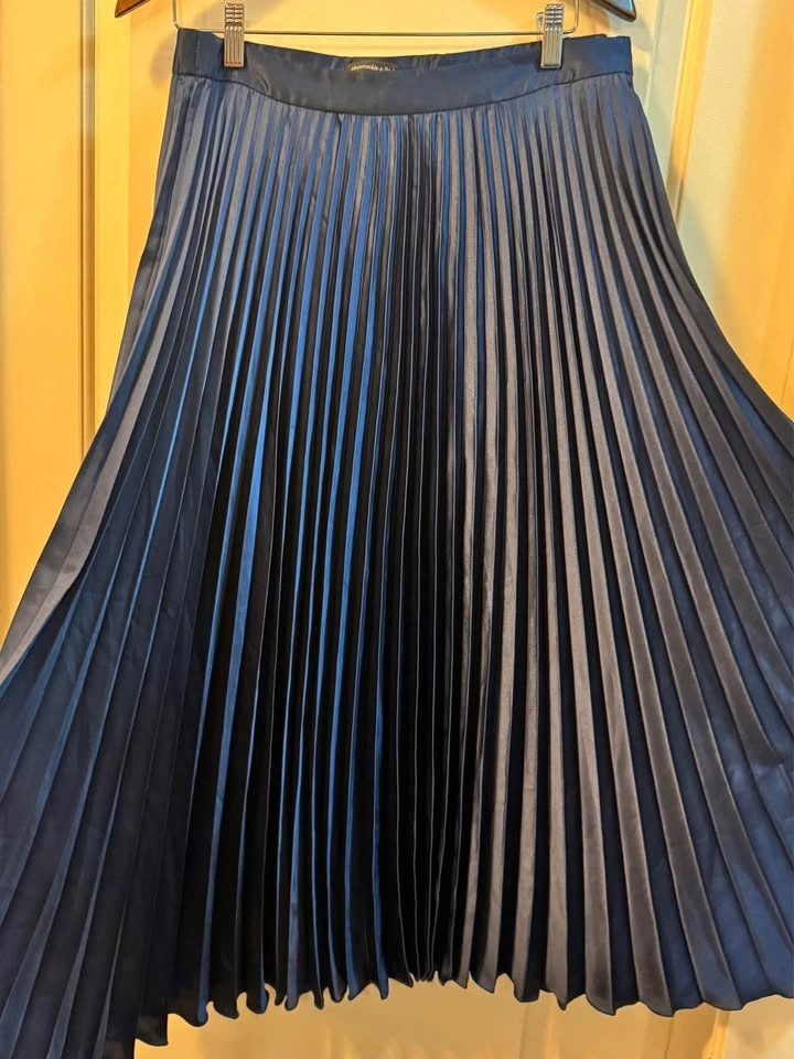 Brand new with tags Abercrombie & Fitch pleated satin midi skirt in a rich navy blue. This beautifully tailored skirt features a fluid satin finish with elegant sheen, classic accordion pleats, a flattering high-rise waistband, and a midi length silhouette in a timeless deep navy tone. Effortlessly transitions from office to evening. Size: Medium. Condition: New with tags. Original Retail: $112 CAD.