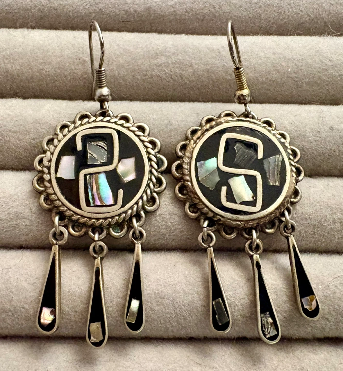 A diverse collection of earrings featuring gold-toned, silver-toned, and mixed-material designs. Styles include hoops, studs, dangles, and geometric shapes. Includes intricate mosaic and inlay details.