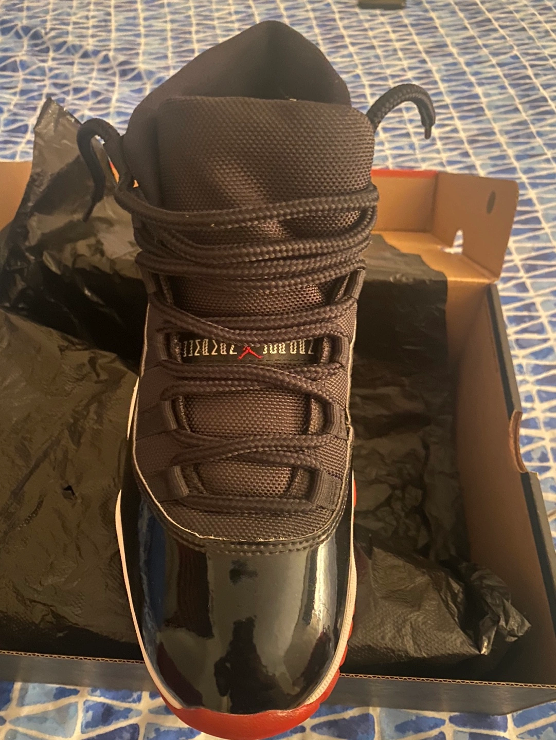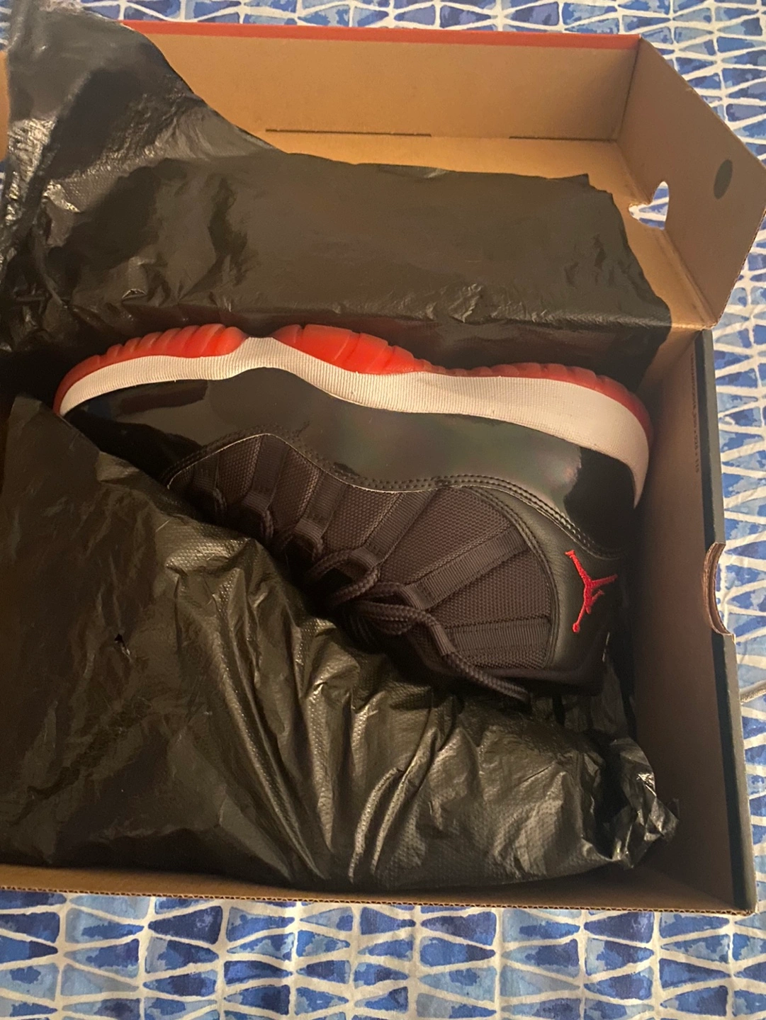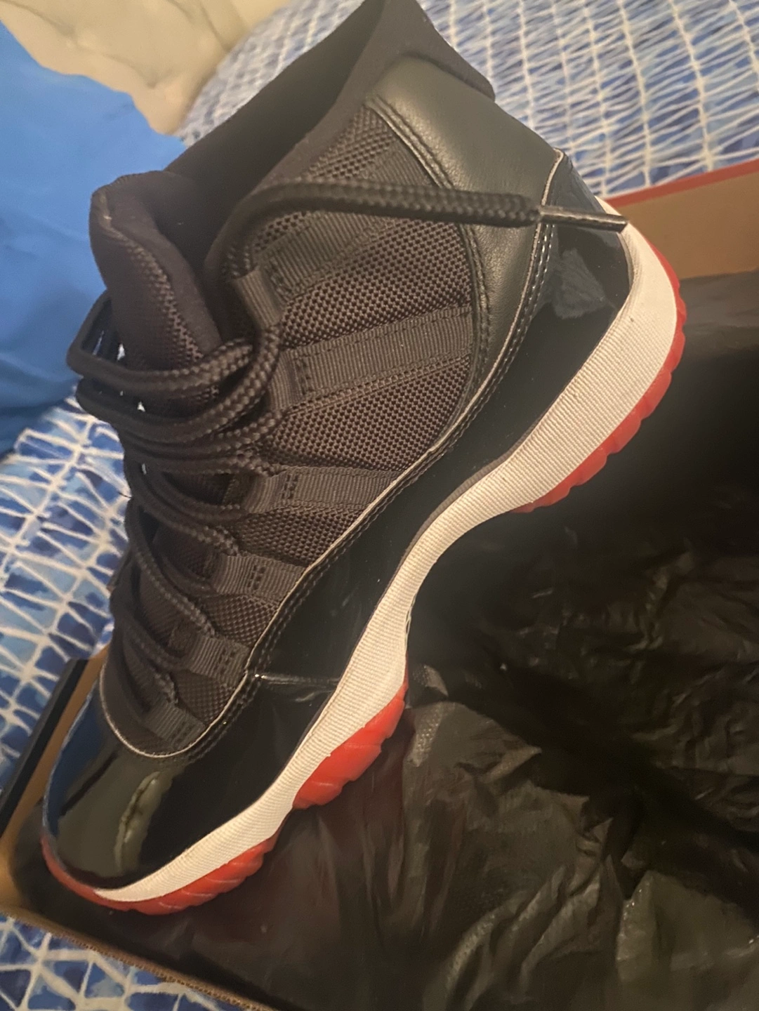 Men's size 9 Air Jordan 11 Retro 'Bred' sneakers. Black patent leather and ballistic nylon upper. Red accents. In original box.