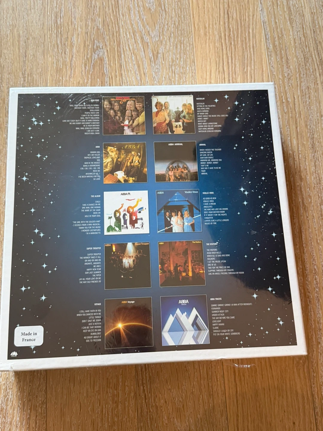 This is the ABBA Vinyl Album Box Set featuring 10 LPs. It includes all their hit albums, plus Voyage and a bonus disc. The records are pressed on heavyweight black vinyl.