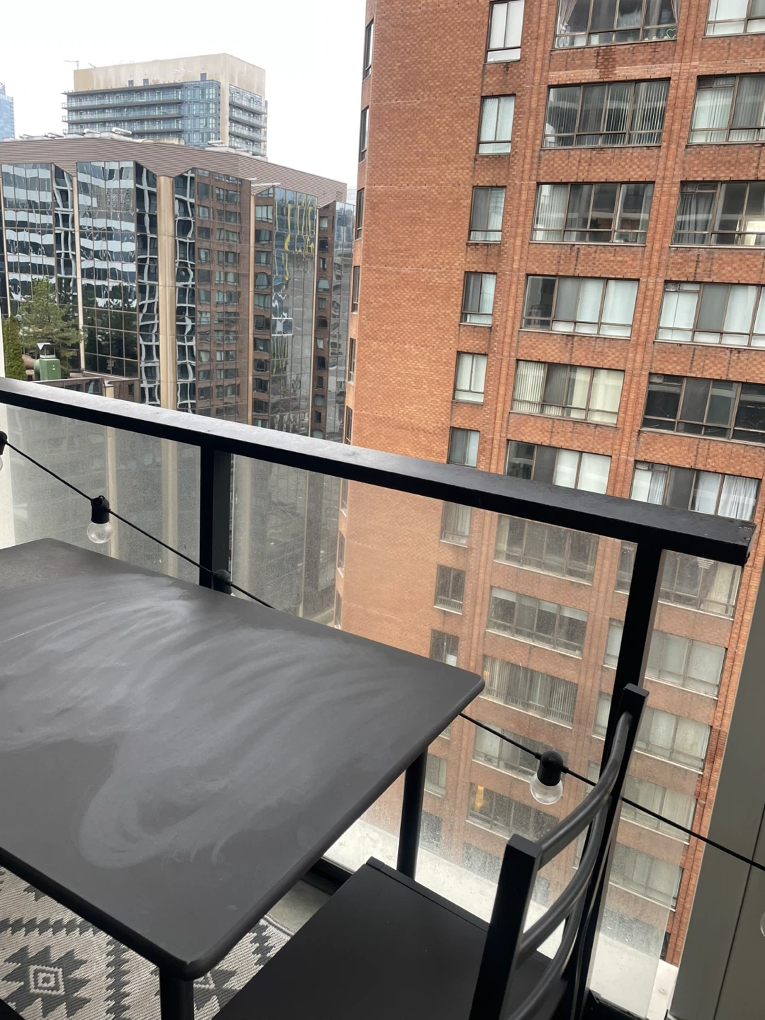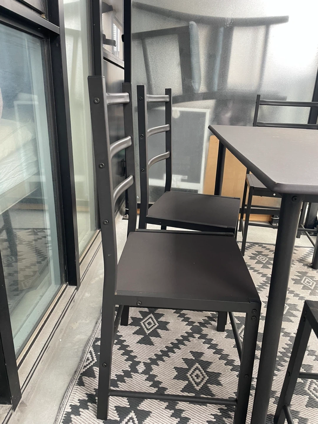 This black dining table set includes a table and four chairs. Perfect for enjoying meals or drinks and can be used indoors and outdoors!