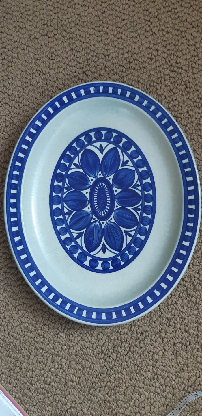 This Midwinter Stonehenge serving platter features the "Blue Dahlia" pattern.