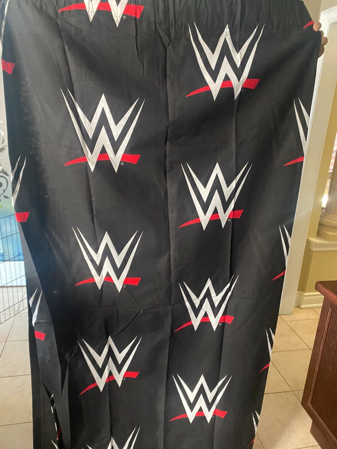 Selling a WWE shower curtain. It features the WWE logo in a repeating pattern on a black background with red accents. Perfect for a wrestling fan's bathroom! There’s 2