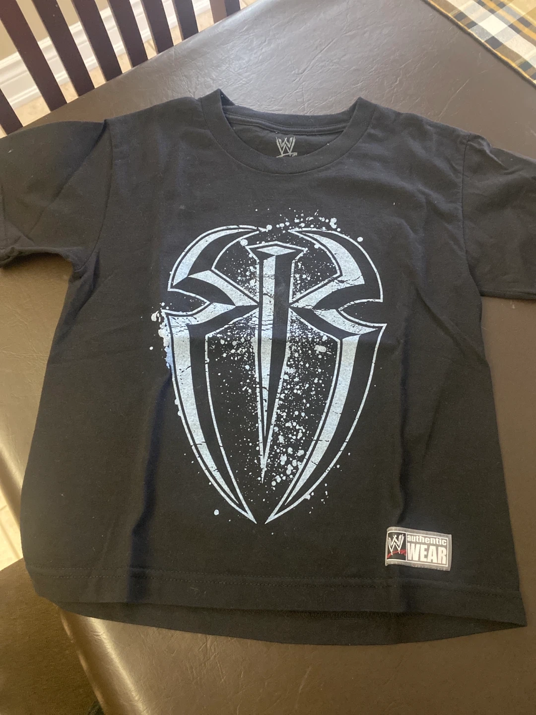 Youth size small WWE t-shirt featuring Roman Reigns. The front has a large logo and the back says "Roman Reigns One Versus All". It's in great shape and ready for a new fan
