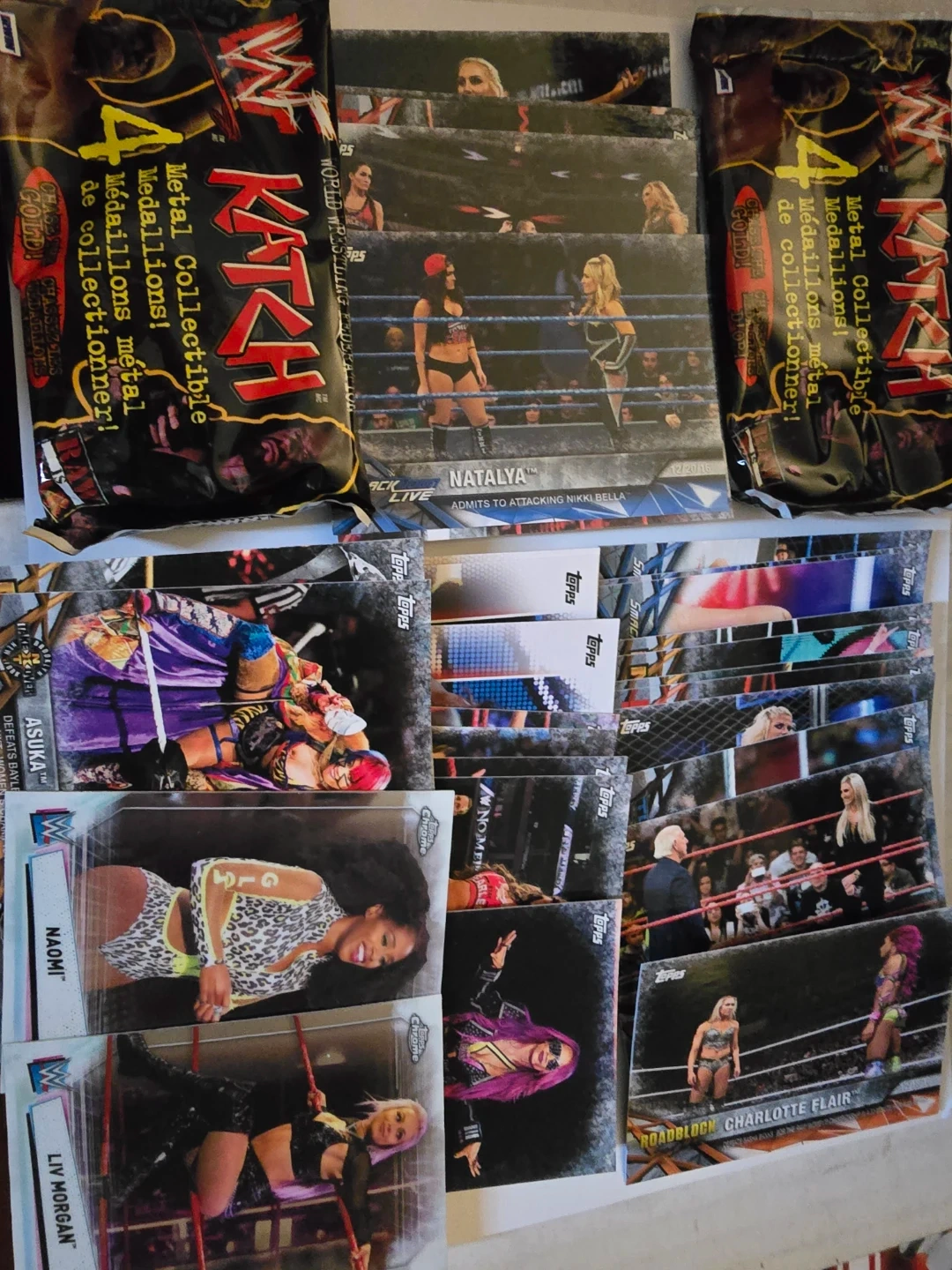 26Selling a collection of WWE Topps Chrome trading cards! You'll find various wrestlers including Naomi, Liv Morgan, Asuka, and Charlotte Flair. Also includes a pack of Metal Collectible Medallions
