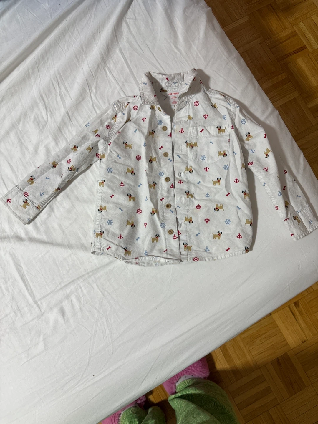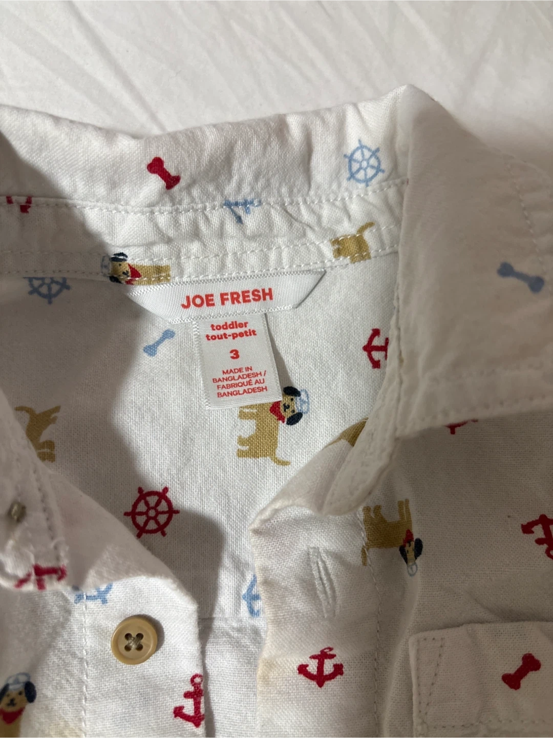 White button-up shirt for toddlers from Joe Fresh. It features a cute pattern with dogs, anchors, and ship wheels. Made in Bangladesh. Perfect for casual wear or a special occasion!