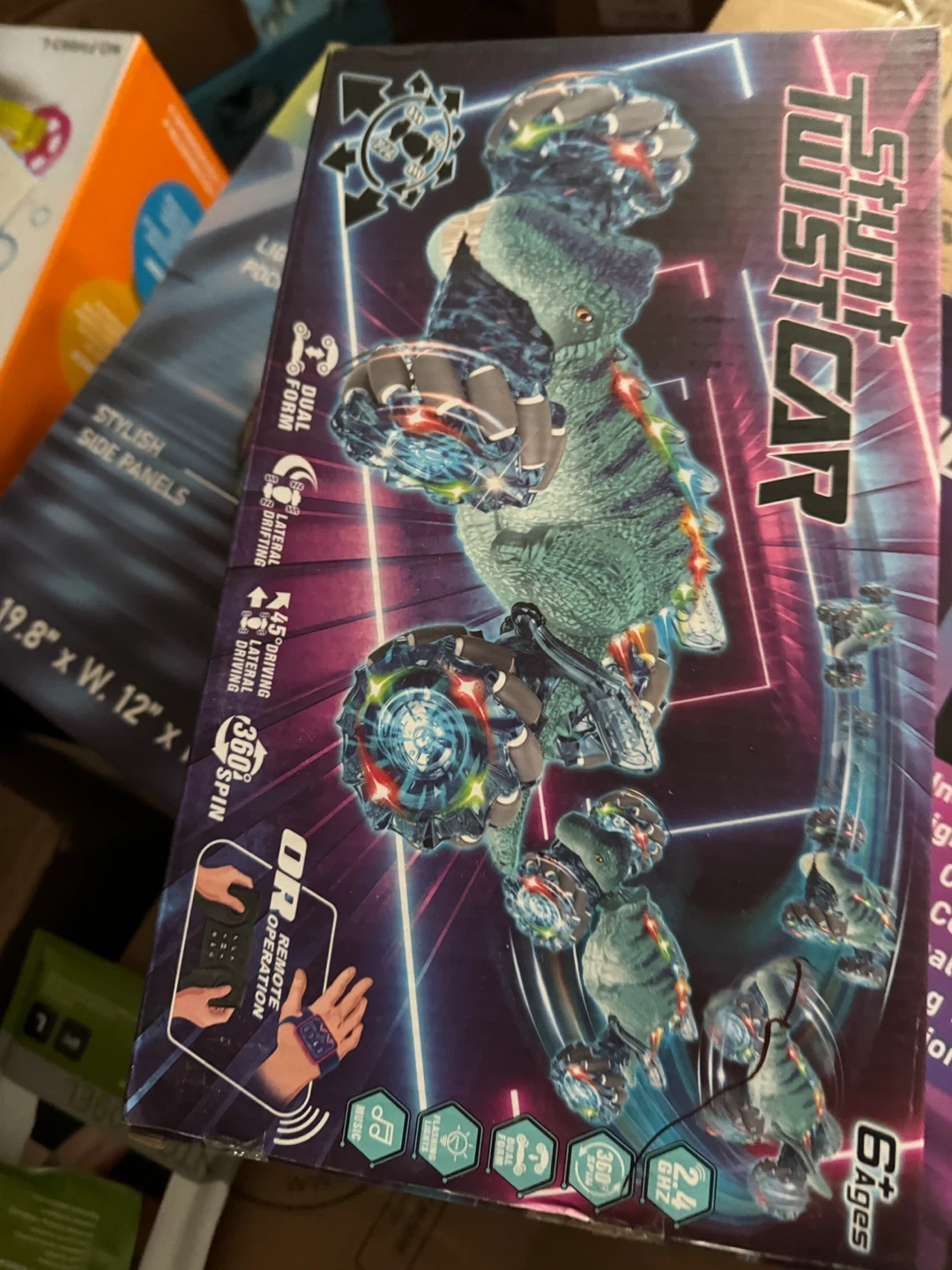 This is a Stunt Twist Car with dual form and 360 spin capabilities. It features lateral driving and includes remote operation with a wristband controller. Recommended for ages 6 and up.