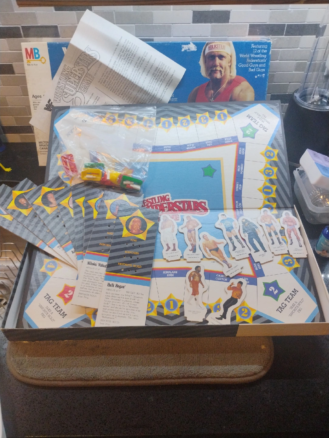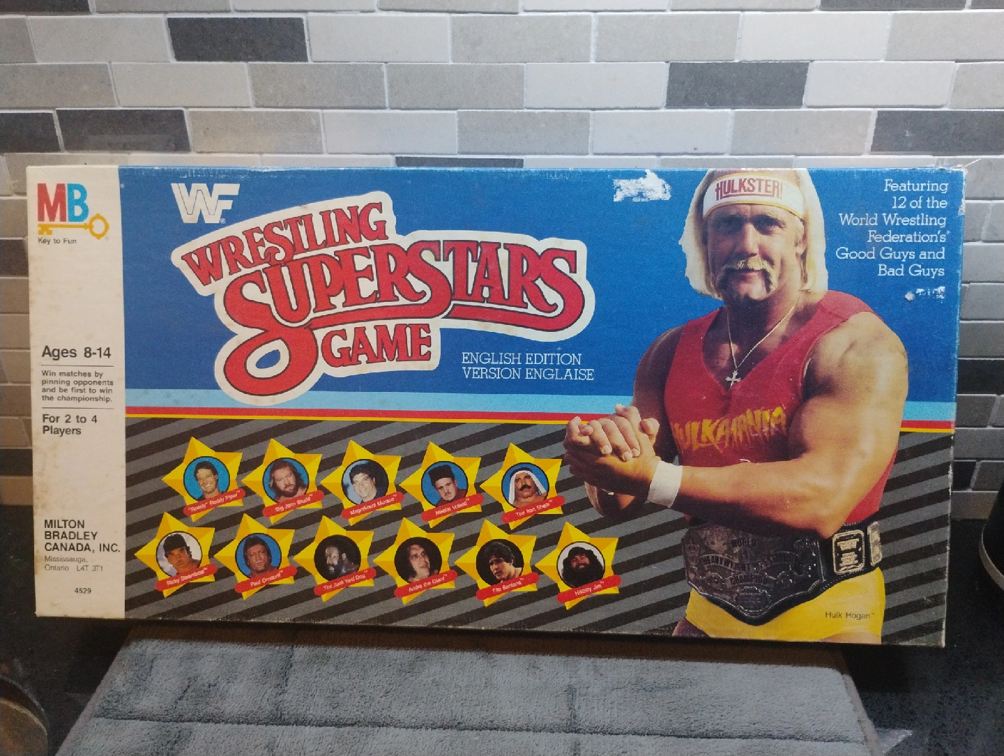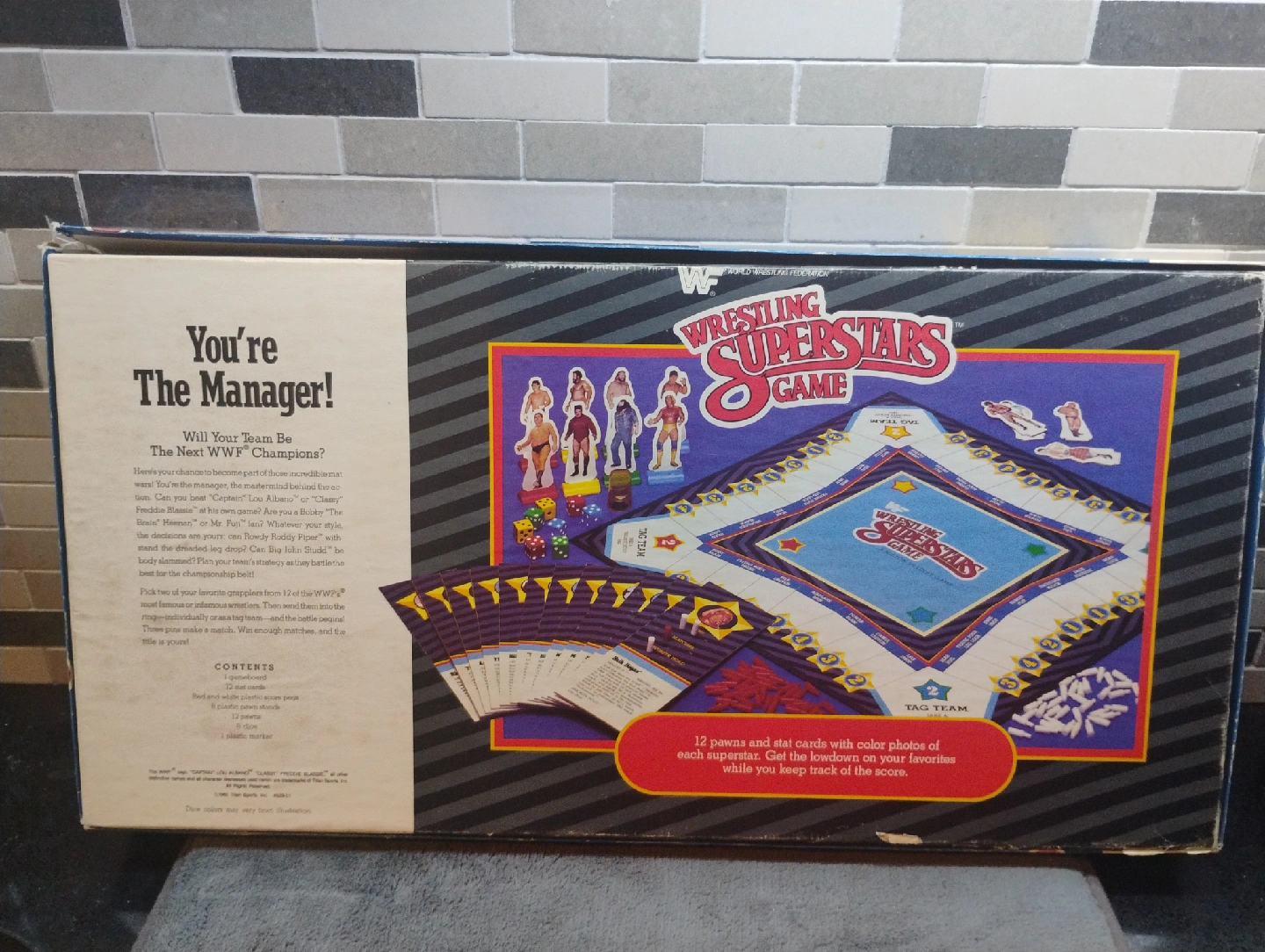 104Selling a classic WWF Wrestling Superstars Game by Milton Bradley! This English edition board game features 12 of the World Wrestling Federation's Good Guys and Bad Guys. Suitable for ages 8-14 and for 2 to 4 players. Includes the board, cards, and pieces as shown in the photos