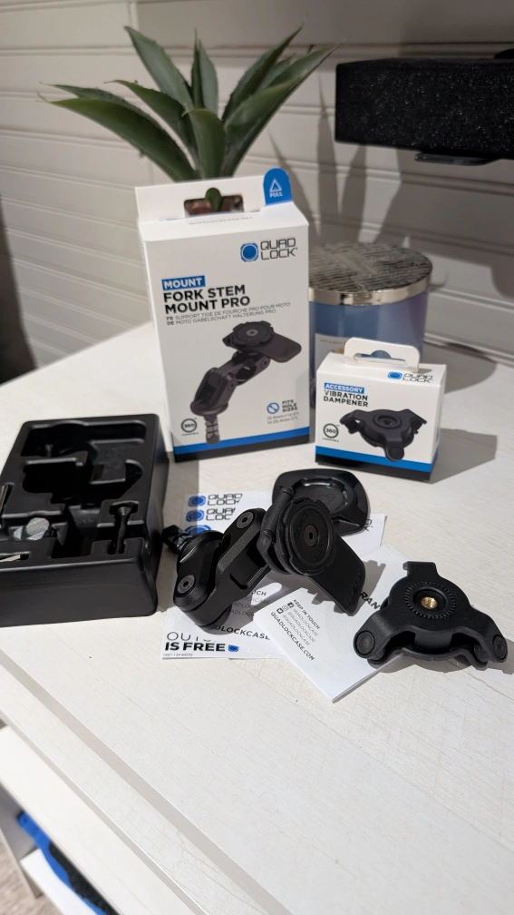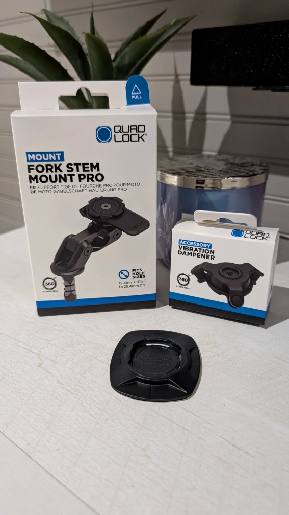 I have a brand new in box, never used, QuadLock fork stem mount pro, vibration dampener, and 3M universal adapter (if you don't have a specific QuadLock case).