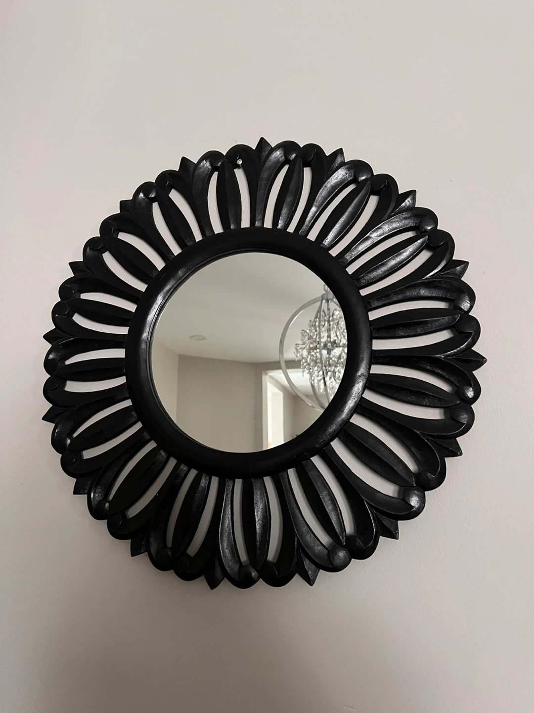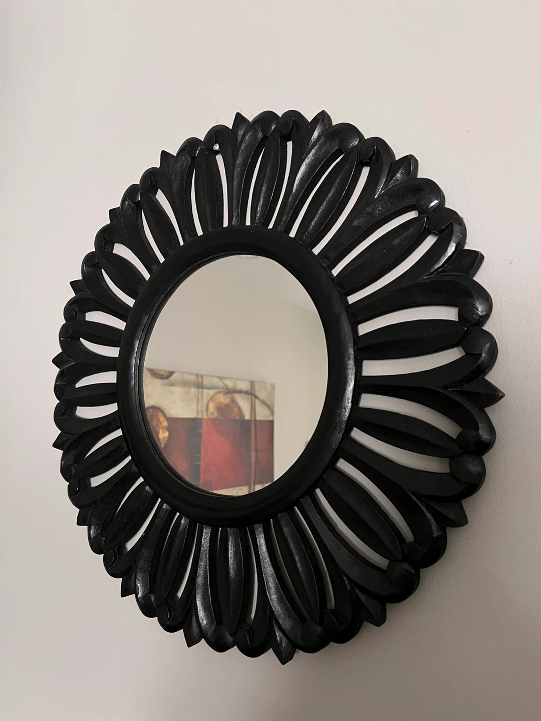 A striking black decorative mirror with a sunburst-inspired frame. This unique piece adds a touch of style to any room. It's made of wood and features a round glass mirror.