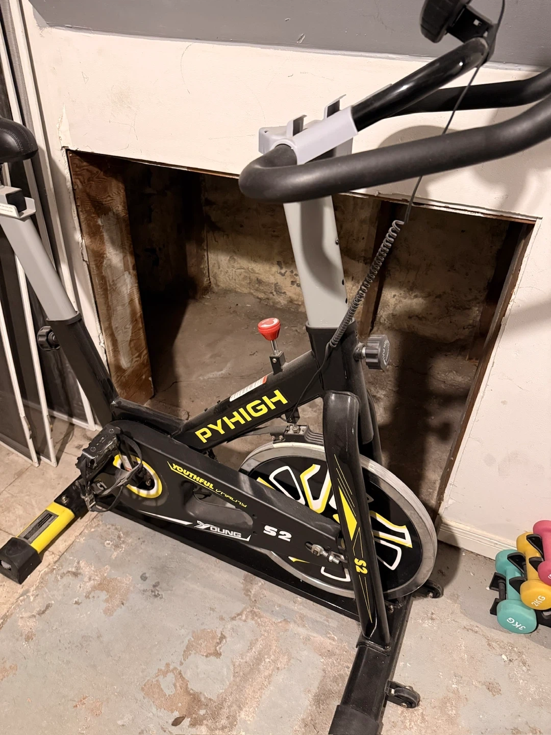 This PYHIGH S2 spin bike is designed for at-home workouts. It has adjustable resistance and a digital display. The bike's frame is black with yellow accents. In perfect working condition. Pick up only.