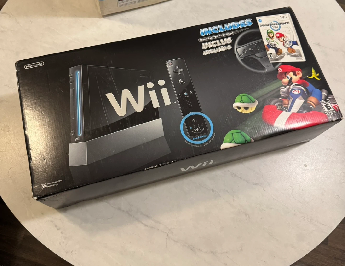 Nintendo Wii console bundle, includes Mario Kart game and Wii Wheel. Now with built-in functionality. Great for family game nights!