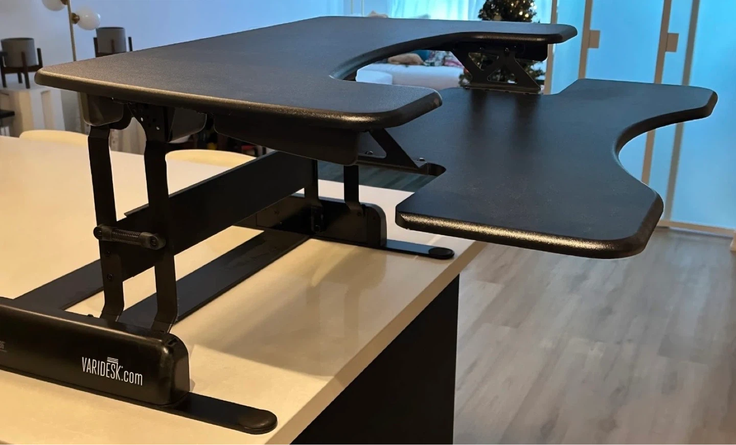 This is a black Varidesk Pro Plus 36 standing desk converter. It's a two-tiered unit with a keyboard tray. It has a lift-assist mechanism for easy height adjustment.