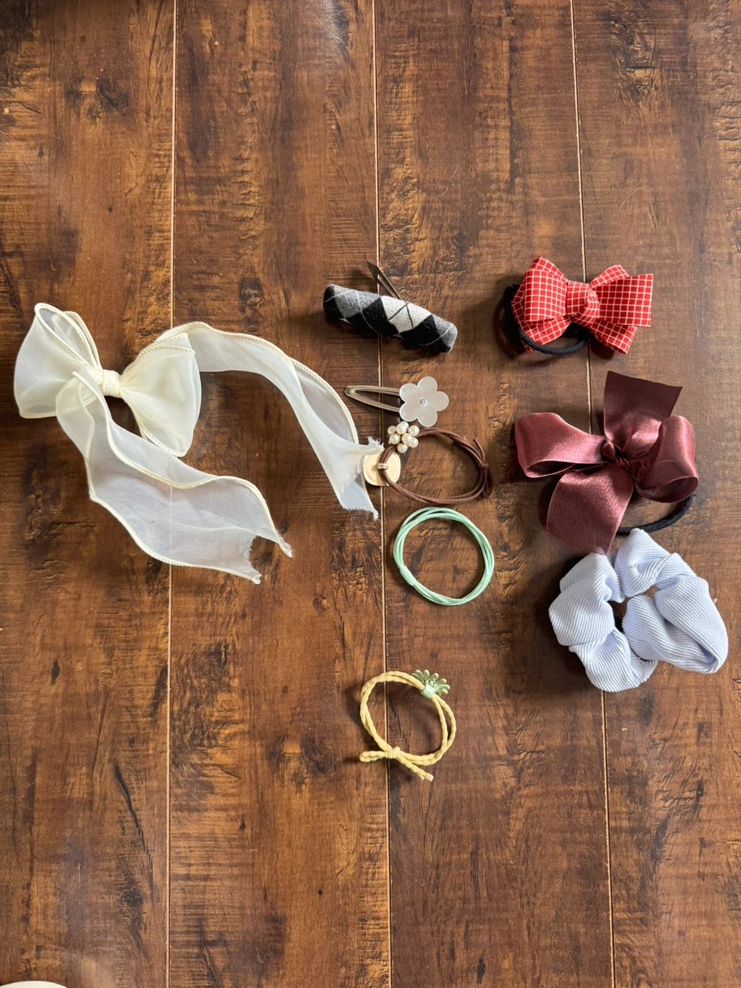 A collection of hair accessories including scrunchies, bows, and hair clips. Features a variety of colours and styles for everyday wear. Great for styling hair!