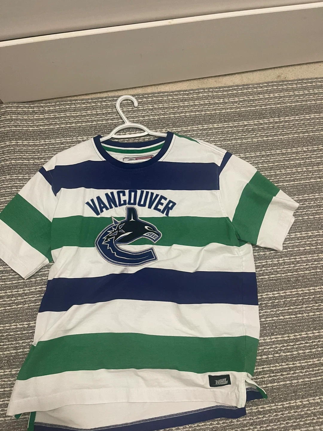 Buy & SellVancouver Canucks Striped T-ShirtVancouver Canucks Striped T-Shirt$17Striped short-sleeve t-shirt featuring the Vancouver Canucks logo. Cotton material. NewConditionNewSizeLarge BrandNHLWHERE TO MEETCheck LocationView MapSELLERAlysonBurke Mountain100 reviews0 chats·0 favorites·1 viewsSEND CHAT TO SELLERHi Alyson! I’m interested in your listing.Hi Alyson! I’m interested in your listing.Get the Karrot app to chatSign In to chat
