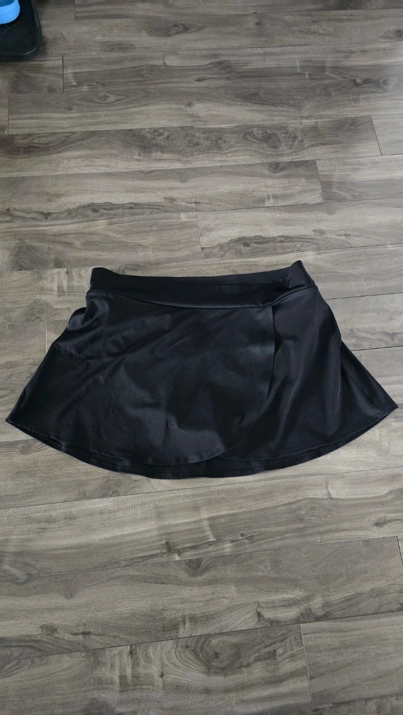 This is a black skirt from Joe Fresh+. It's made of 80% nylon and 20% spandex with a 100% polyester lining. Machine washable with like colours. For swimming, can be used ontop of a one piece bathing suit or on its own.