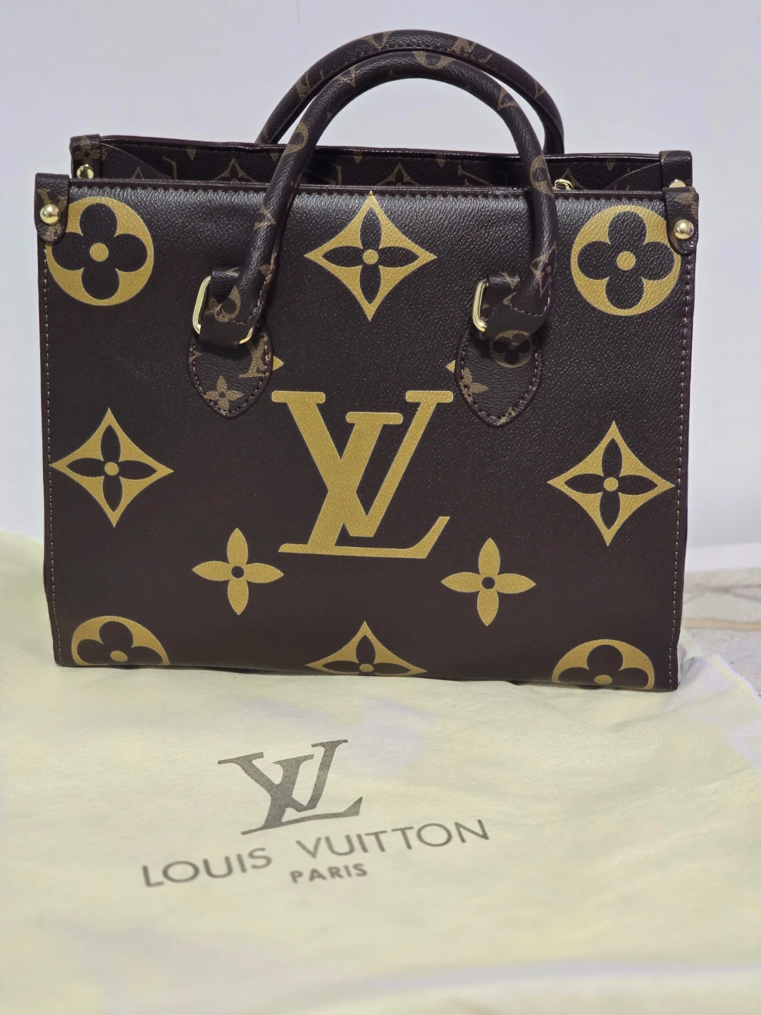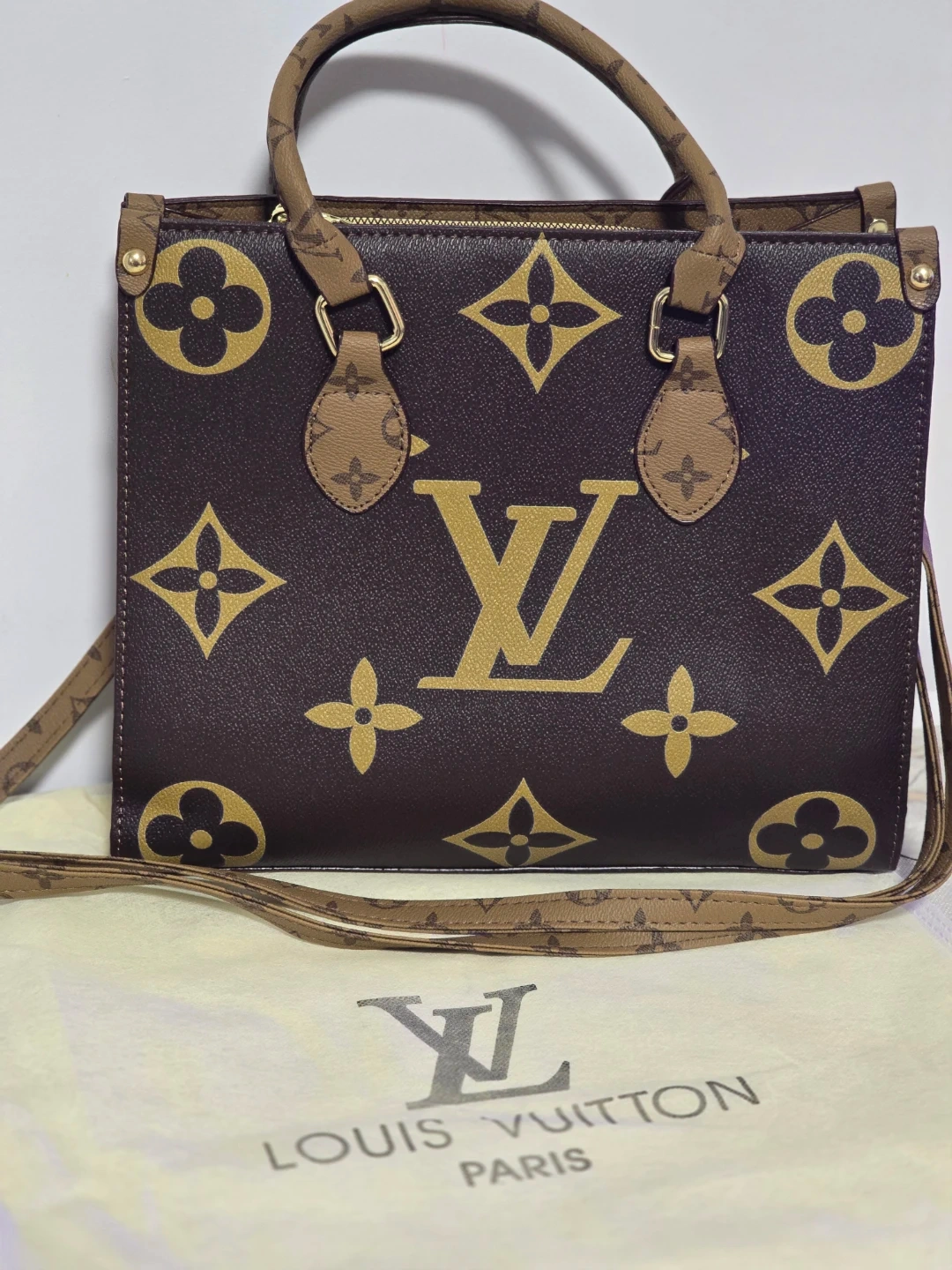 tote bag in monogram canvas. It features dual top handles and a detachable shoulder strap. This bag includes the dust bag for storage.