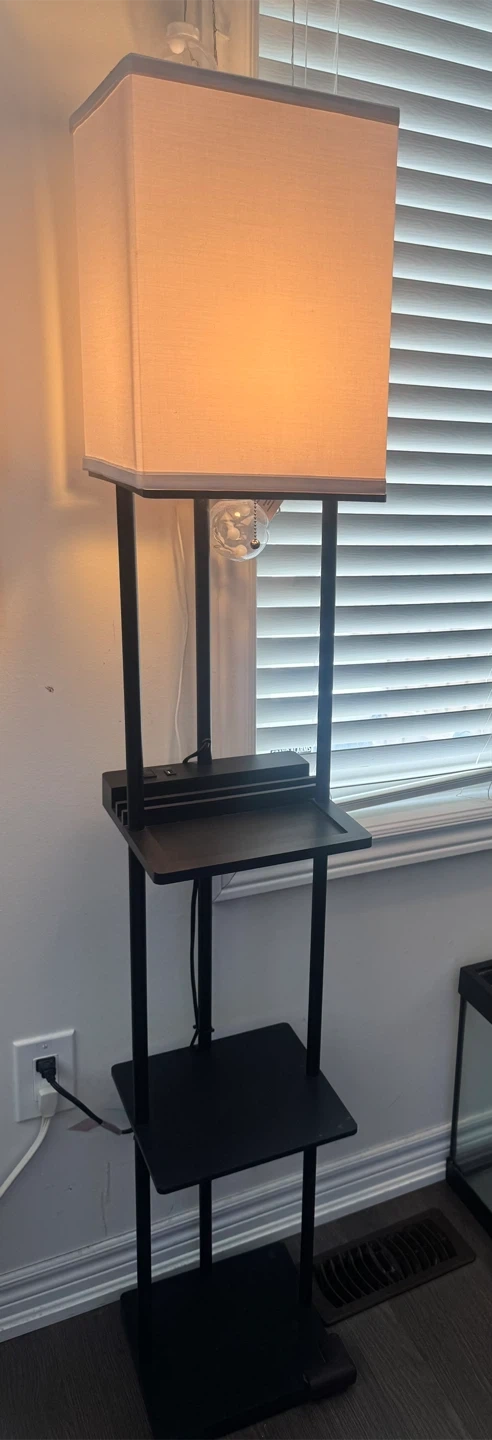 This floor lamp offers convenient lighting and storage. It features two shelves, a built-in power strip with an AC outlet and USB ports The rectangular shade creates a warm ambiance. A great addition to any living room or bedroom!
