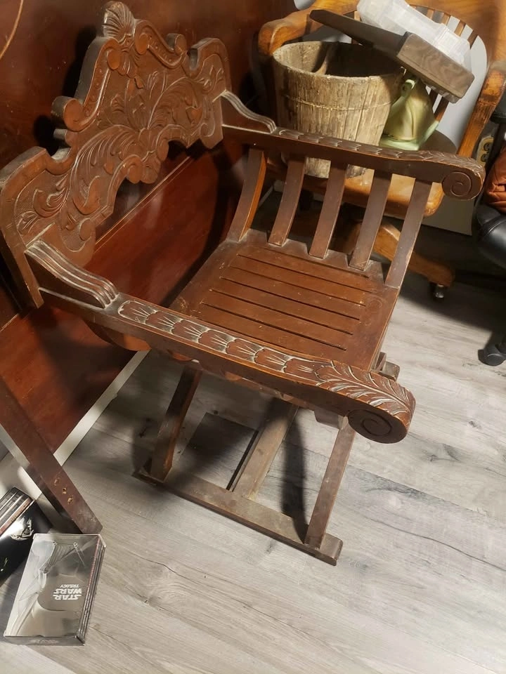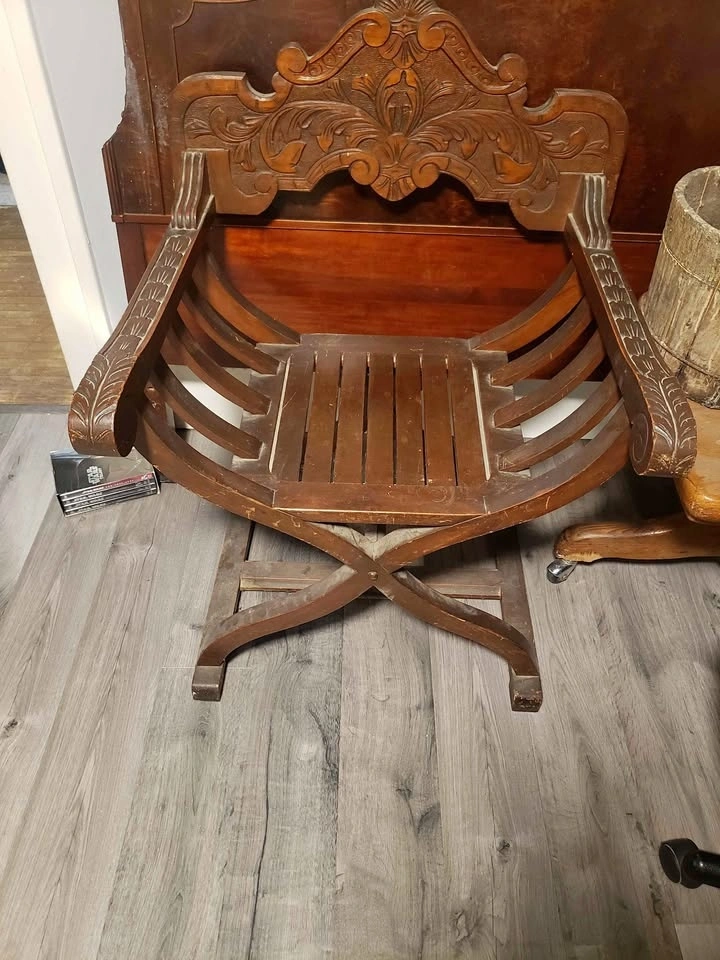 This is a Savonarola chair with an X-shaped frame, originating in the Italian Renaissance. These chairs are iconic symbols of Renaissance furniture, treasured for their elegance and unique structural design.