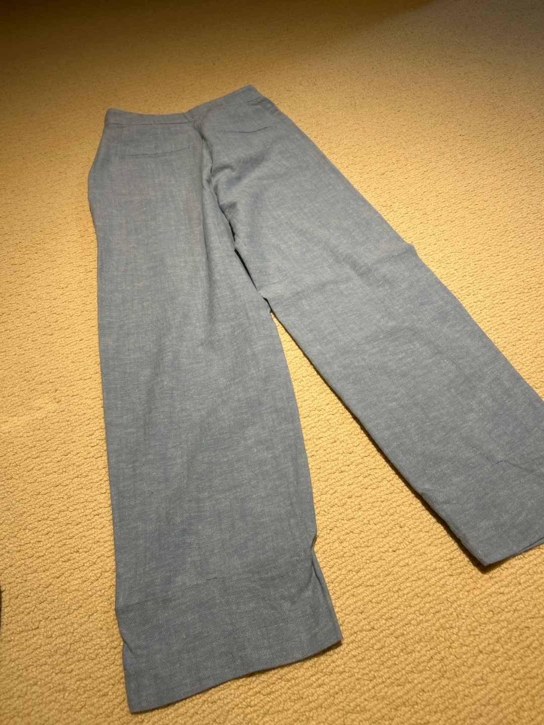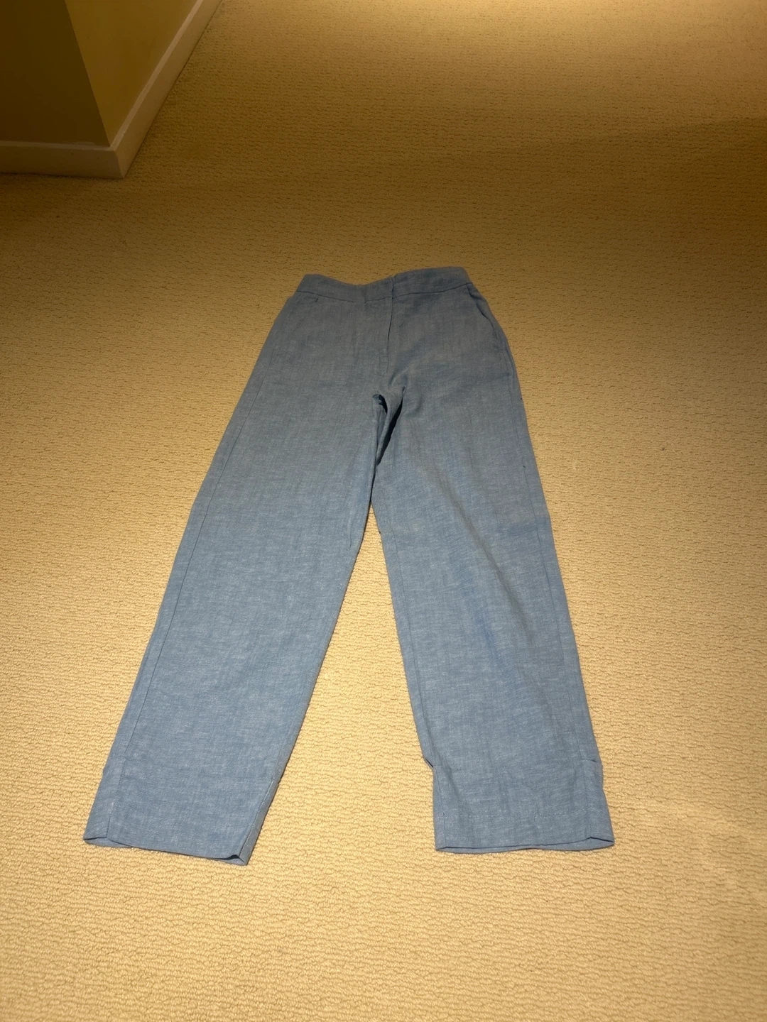 These light blue pants have a slight wide leg silhouette. They feature a button and zipper closure. The fabric appears to be a linen blend.