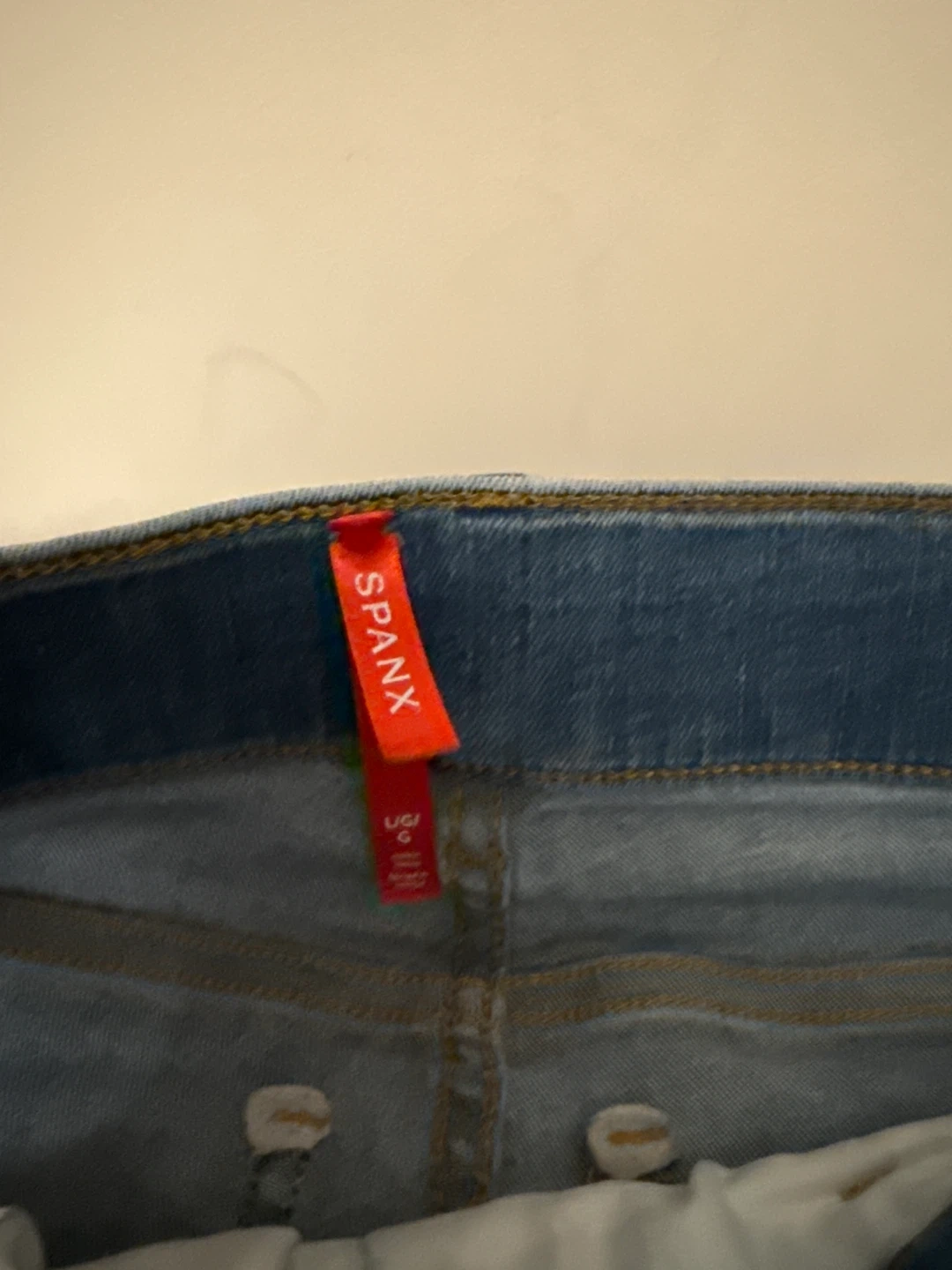SPANX women's wide leg jeans in a light wash blue. These pants offer a comfortable and stylish silhouette. Made from a denim fabric with a slight stretch for ease of wear.