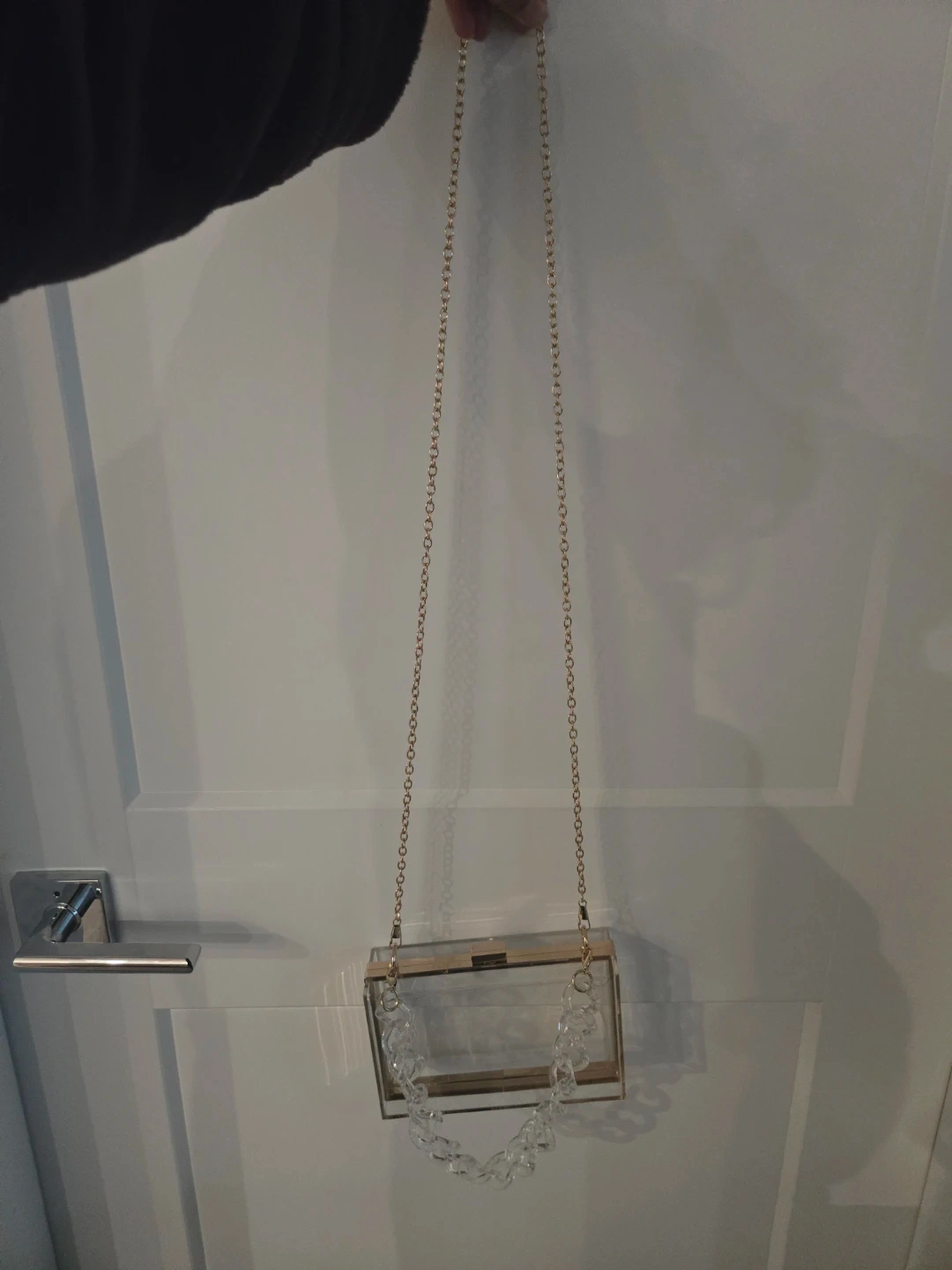 Clear purse with clasp and 2 different chains (gold and clear). Perfect for stadium events (sports, concerts, parties etc)