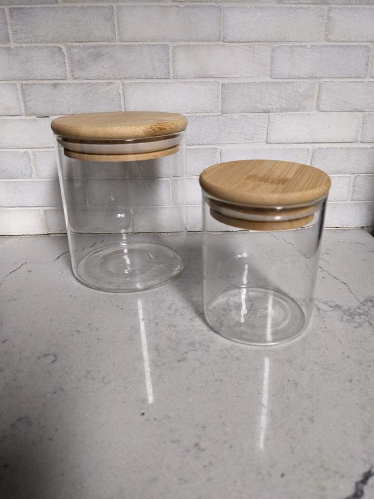 Two glass canisters. Clear glass. Bamboo lids. Perfect for storing food items in your kitchen. See pic 2 for size reference