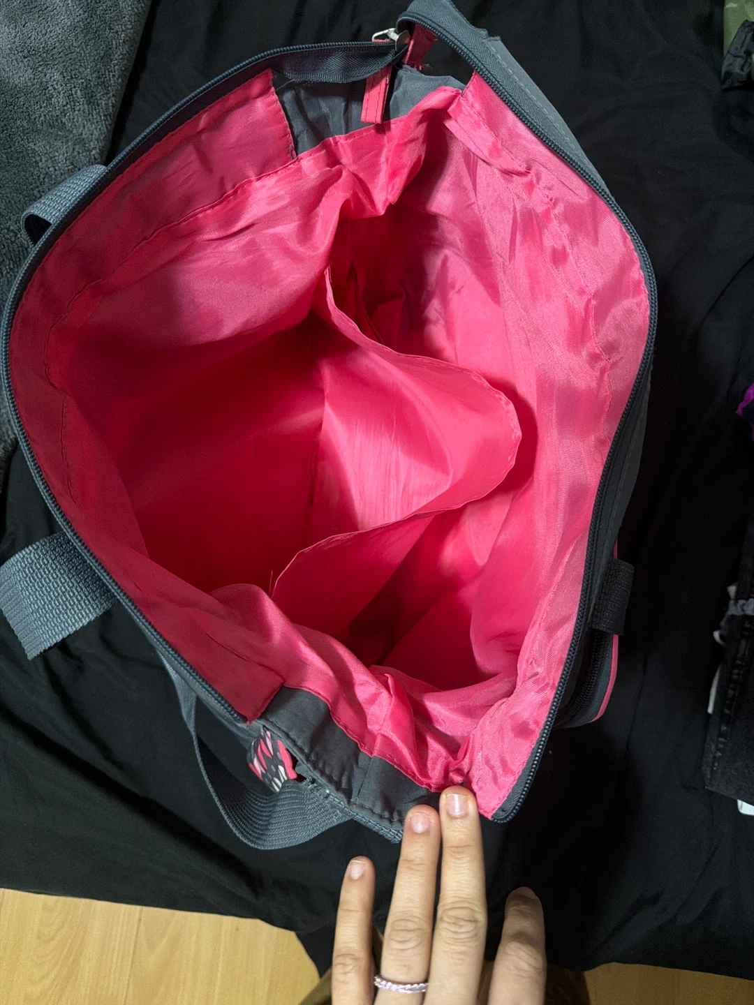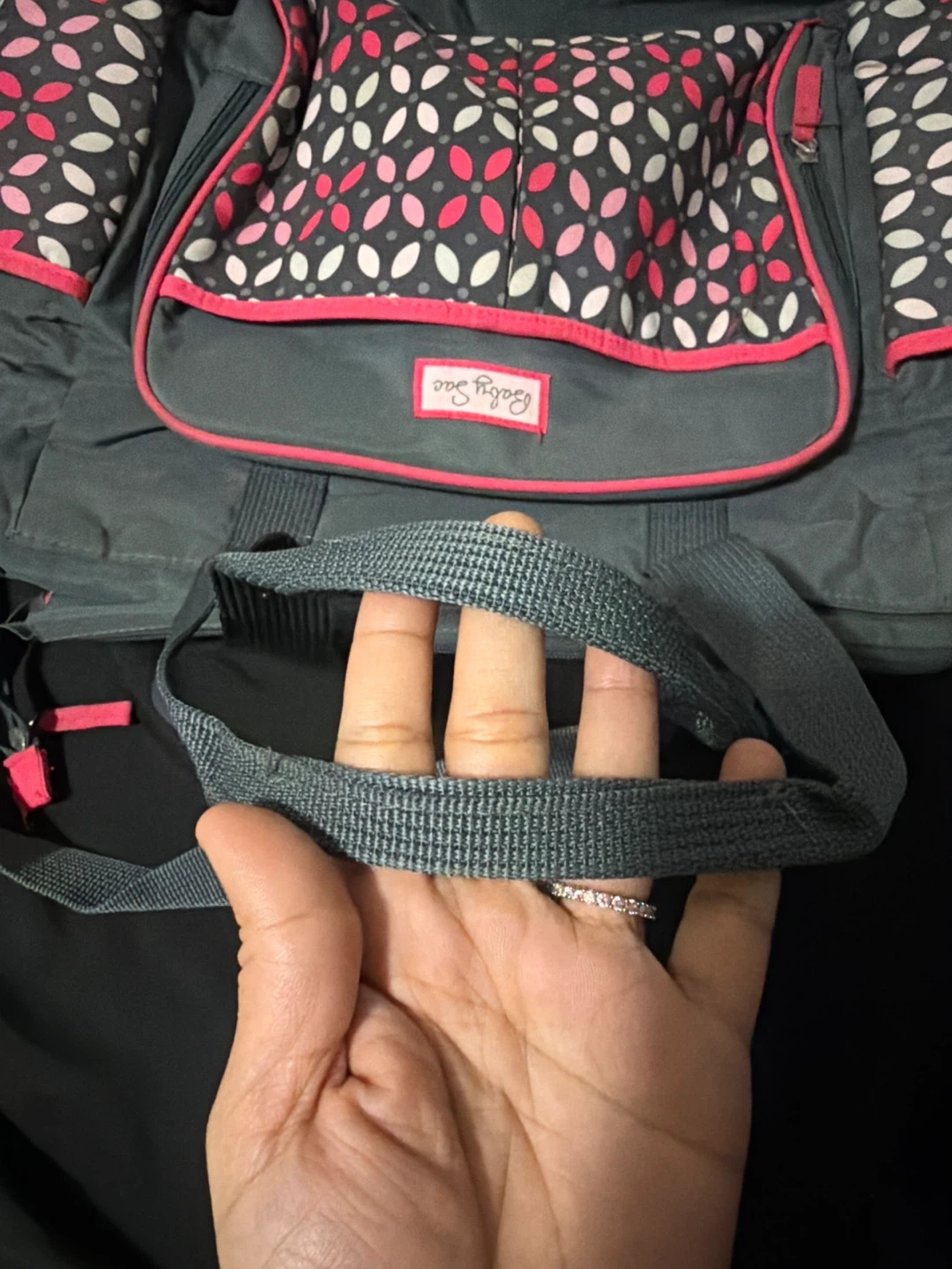 Grey and pink patterned diaper bag by Baby Soo. It has a spacious main compartment with interior pockets. Includes two sturdy top handles and a removable shoulder strap.
