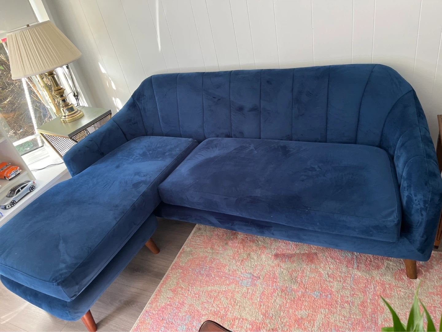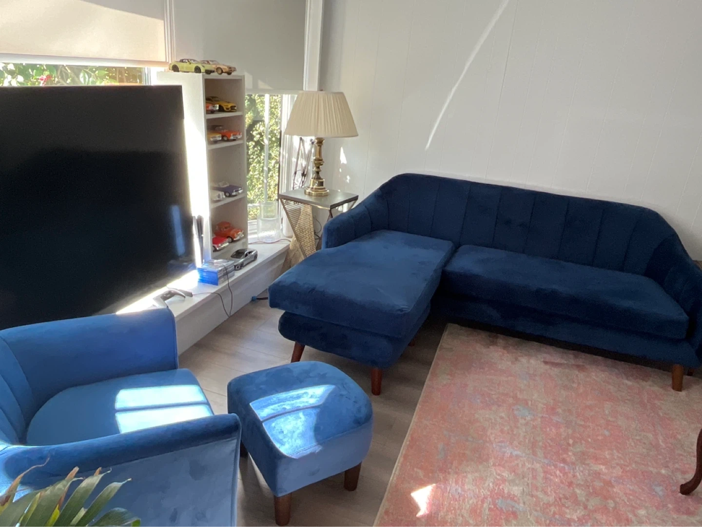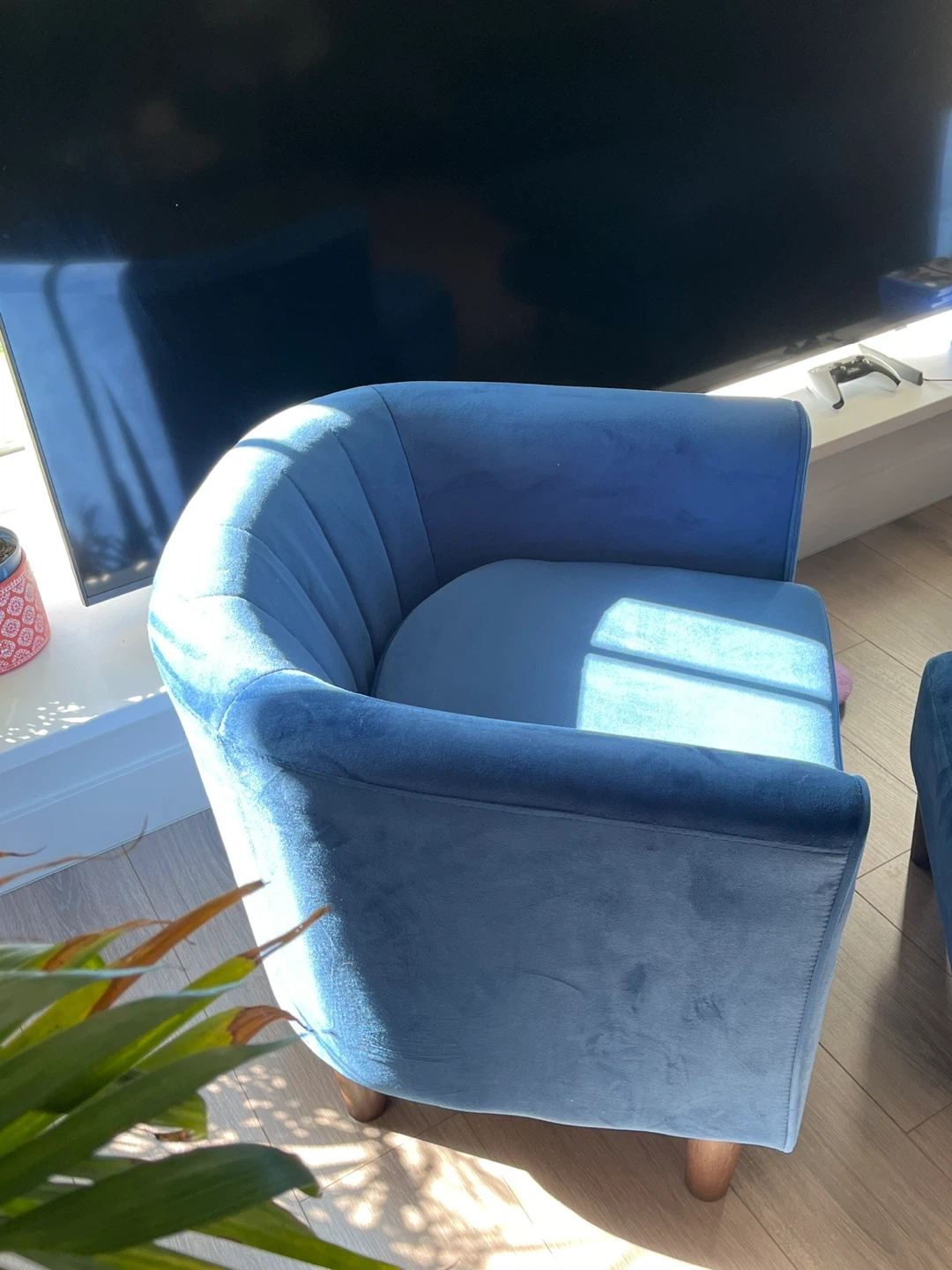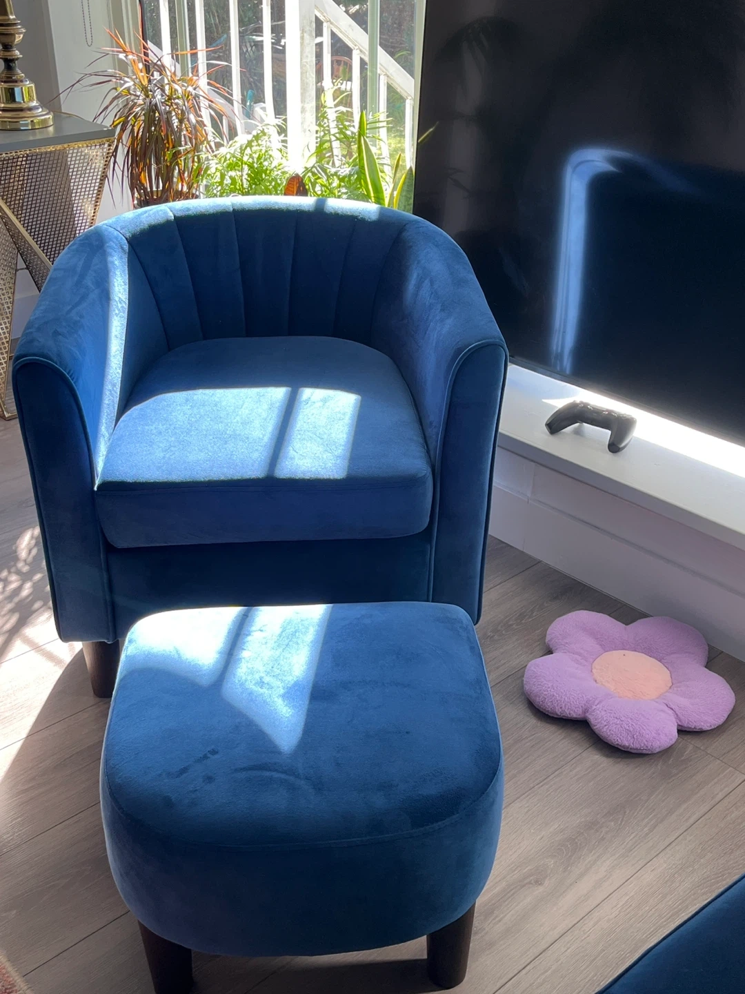 A stylish blue velvet accent chair complete with a matching ottoman. From wayfair. This chair offers a comfortable spot to relax. Upholstered in soft velvet material.