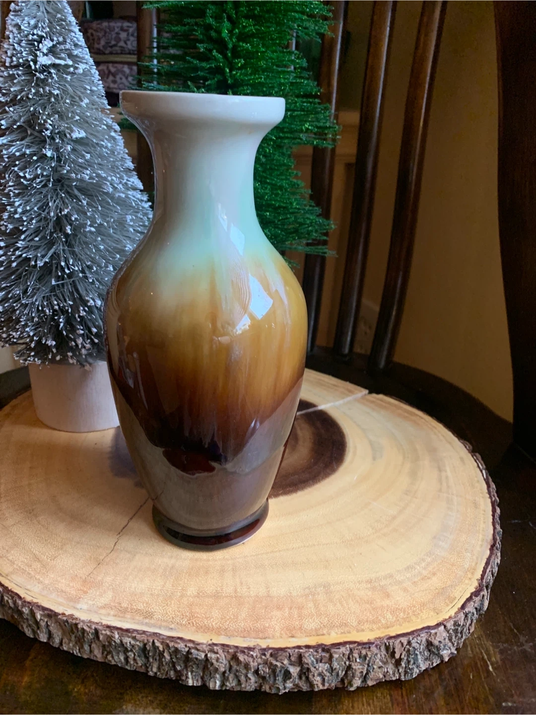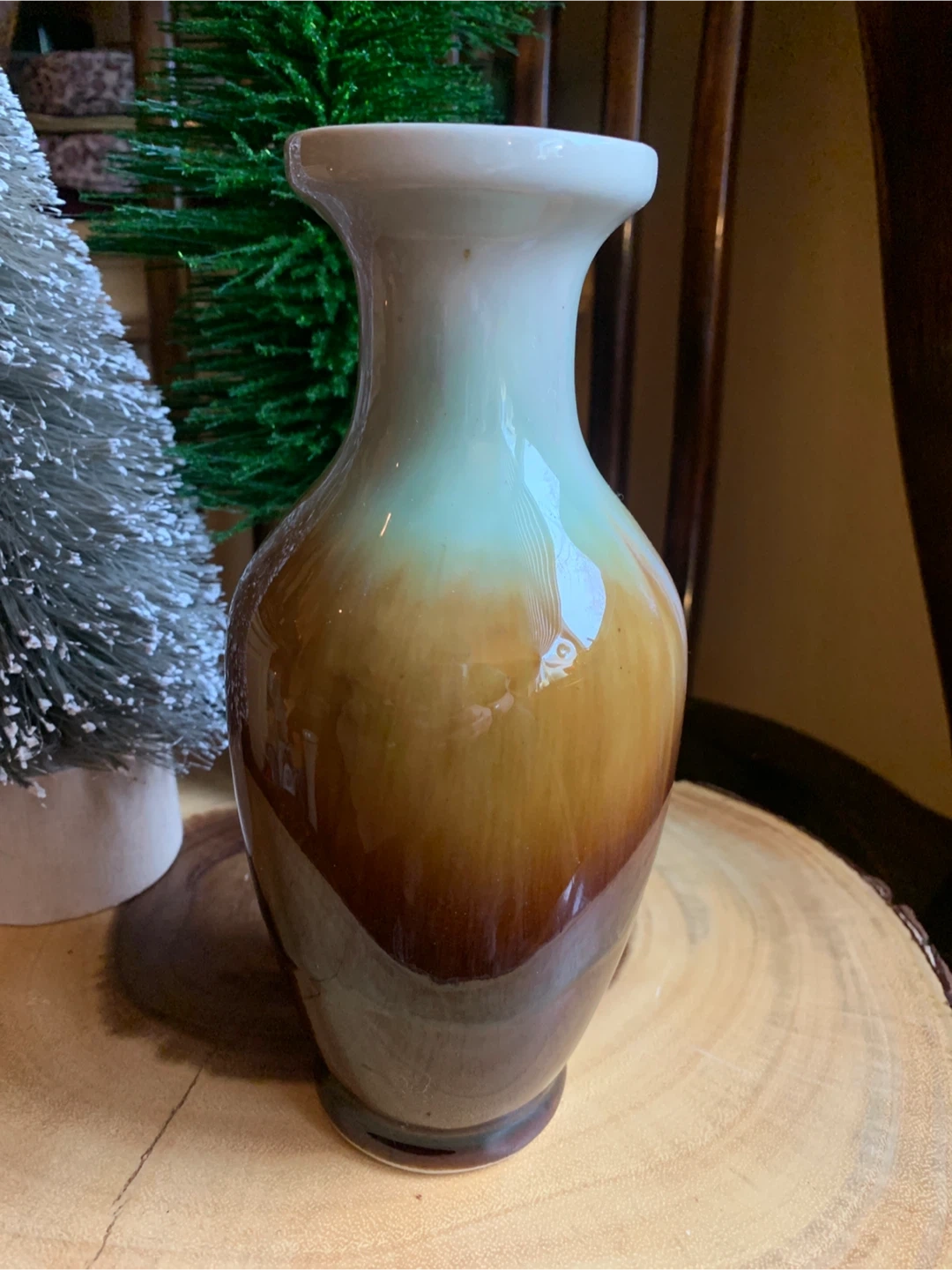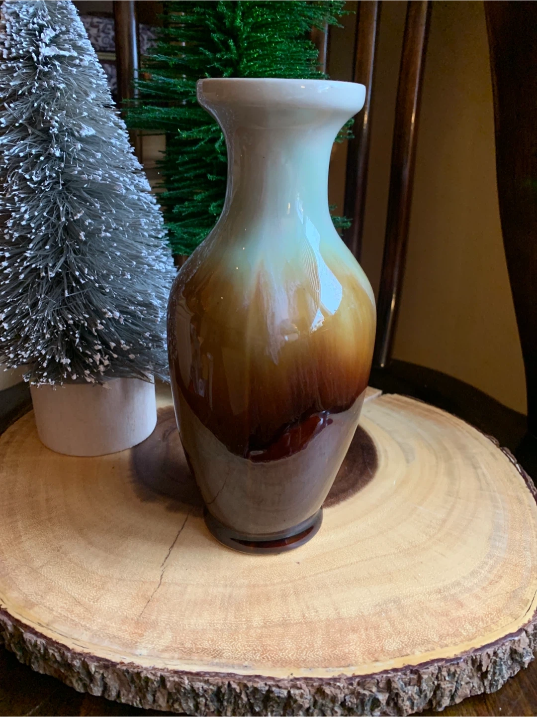A classic drip glazed pottery vase with a beautiful ombre finish transitioning from cream to light green to deep brown. It's perfect for displaying fresh flowers or as a standalone decorative piece sitting on a bookshelf or table. This vase adds a touch of rustic charm to any room with its lovely shape and colouring!