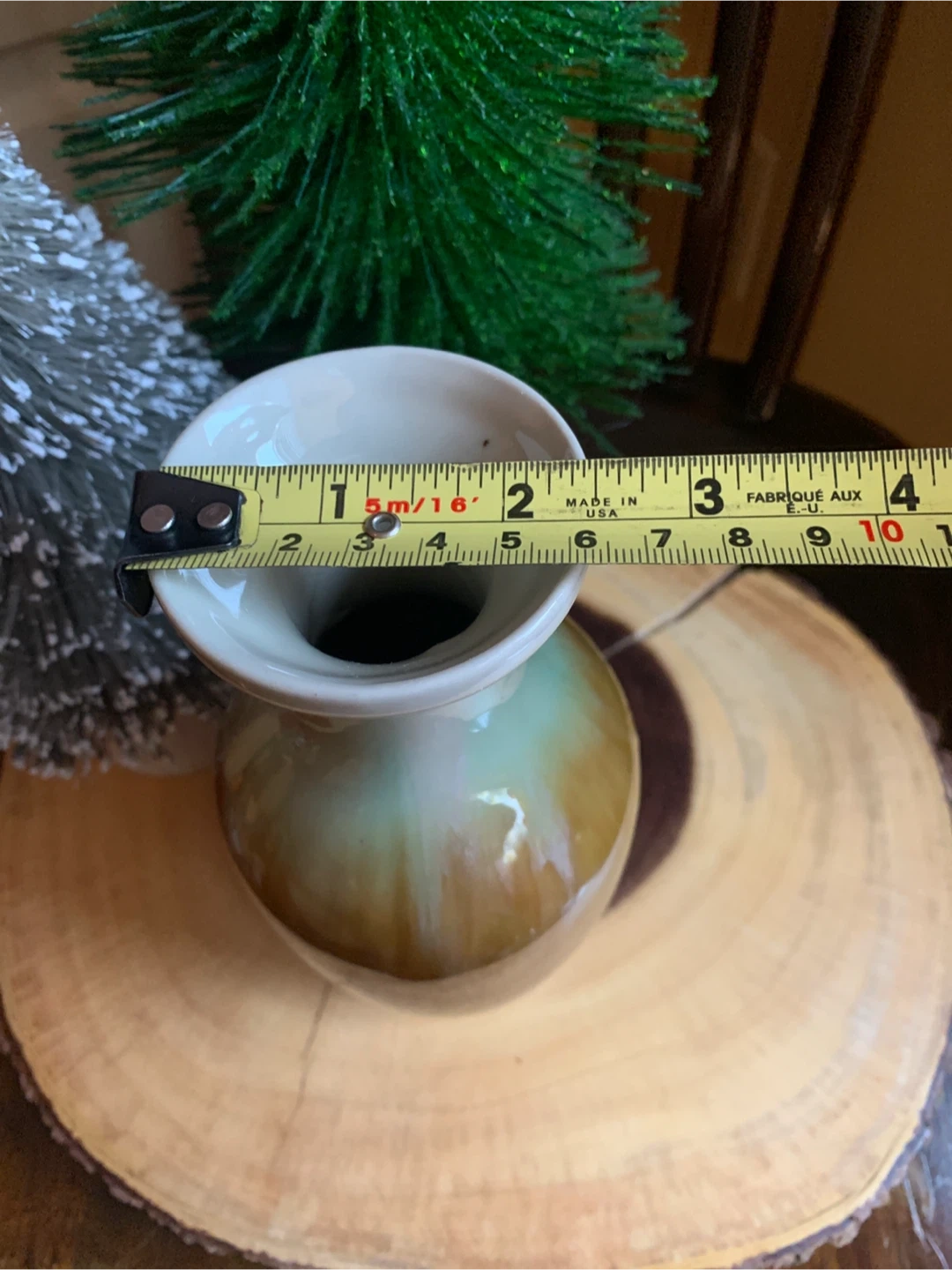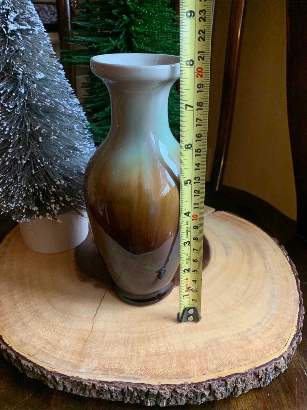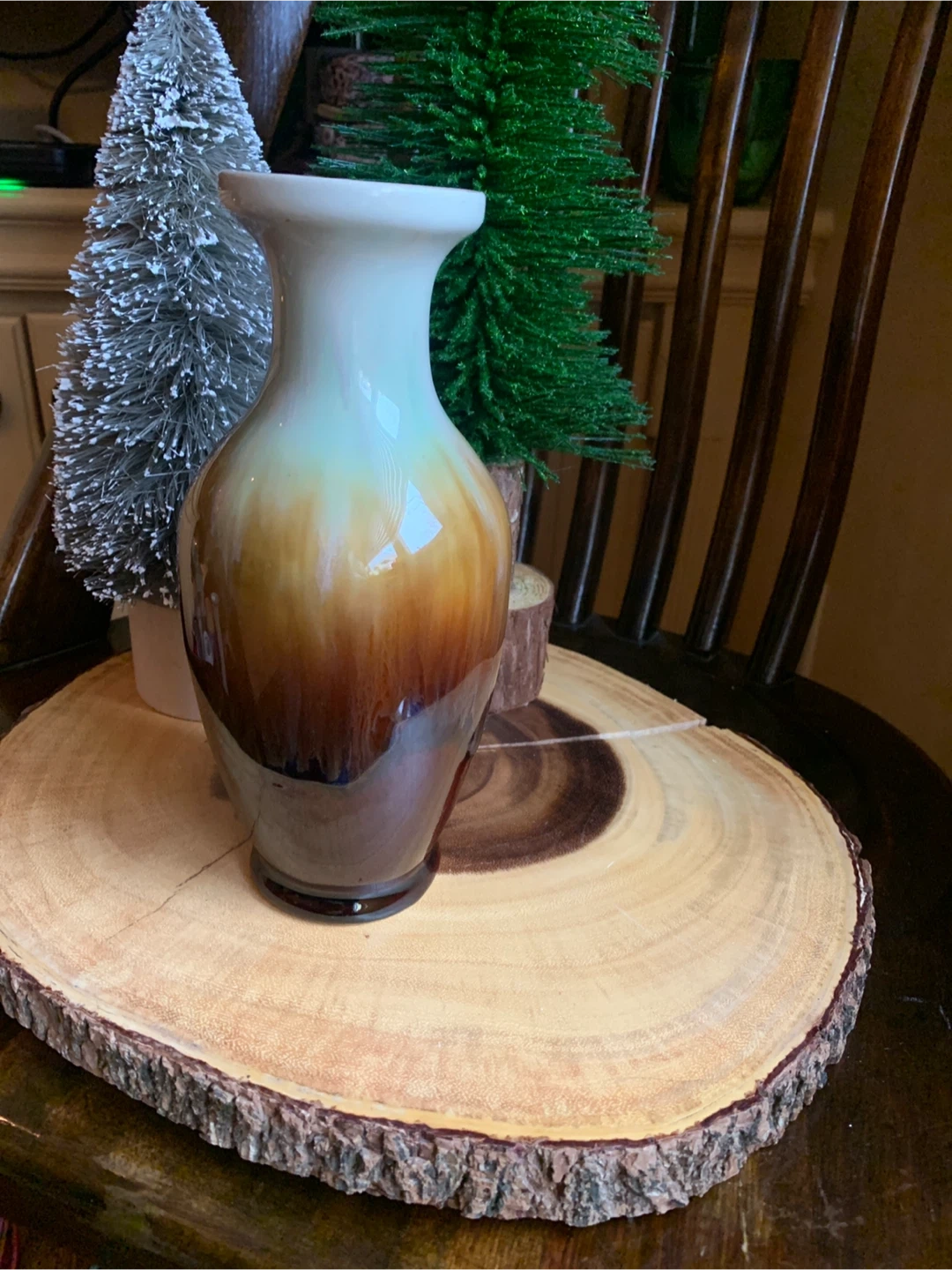 A classic drip glazed pottery vase with a beautiful ombre finish transitioning from cream to light green to deep brown. It's perfect for displaying fresh flowers or as a standalone decorative piece sitting on a bookshelf or table. This vase adds a touch of rustic charm to any room with its lovely shape and colouring!