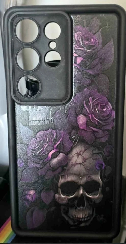 Great pre-owned condition. A heavy-duty, rugged protective phone case featuring a striking alternative/gothic design with deep purple roses and skulls. Specifically designed to fit the Samsung Galaxy S25 Ultra, featuring the exact rear camera cutouts for this model. Thick black rubberized bumpers provide excellent drop protection and grip.