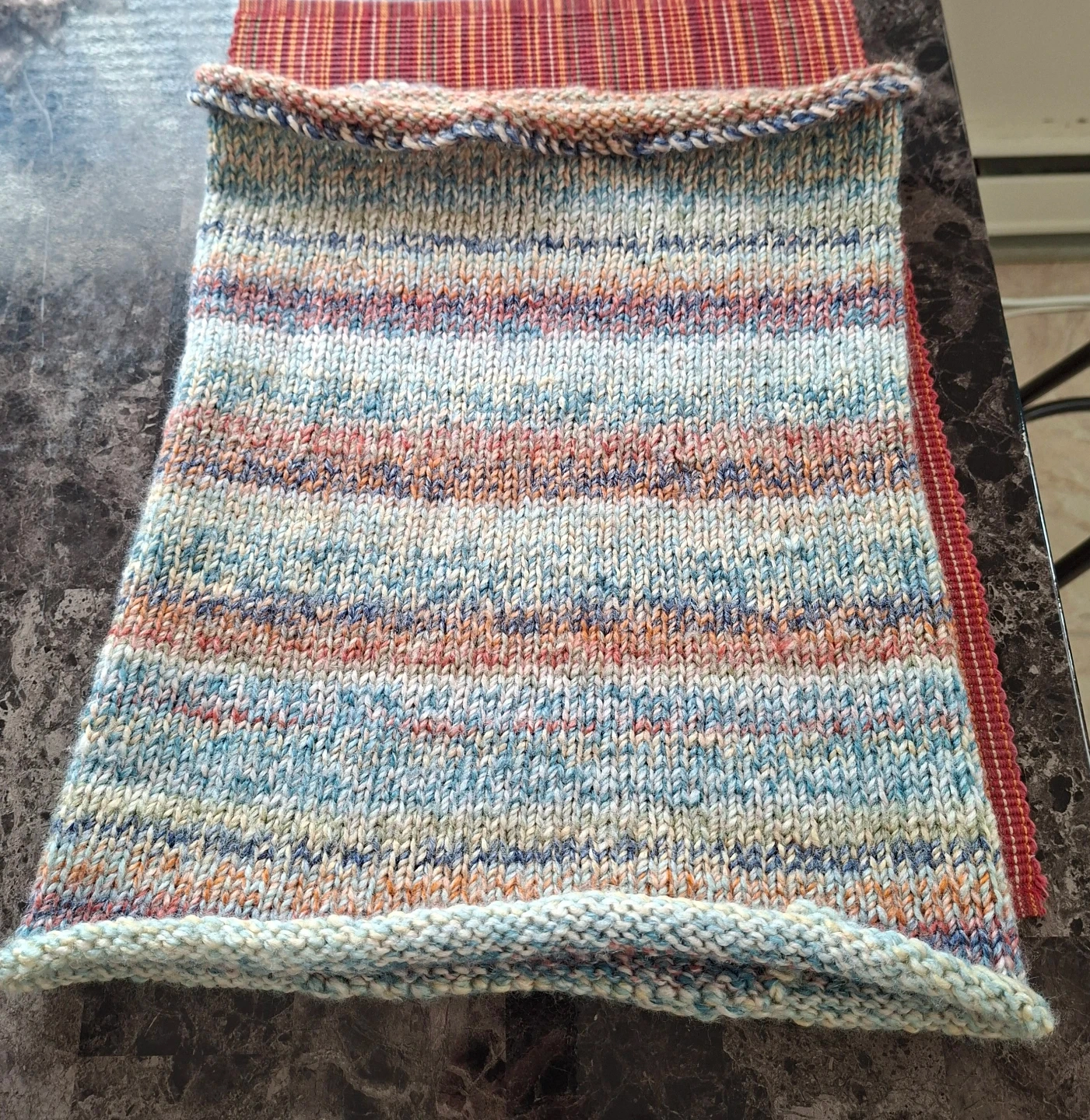 Cozy, hand-knitted cowl scarf with a multicoloured yarn, keeping the neck/face warm. It's made of a soft wool blend. This cowl is perfect for adding a pop of colour to your outfit on a chilly day!