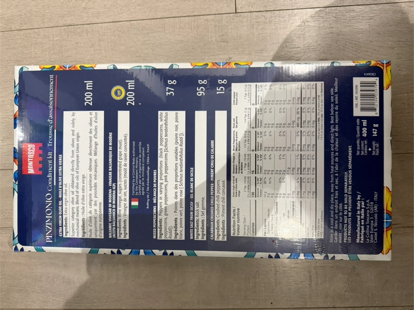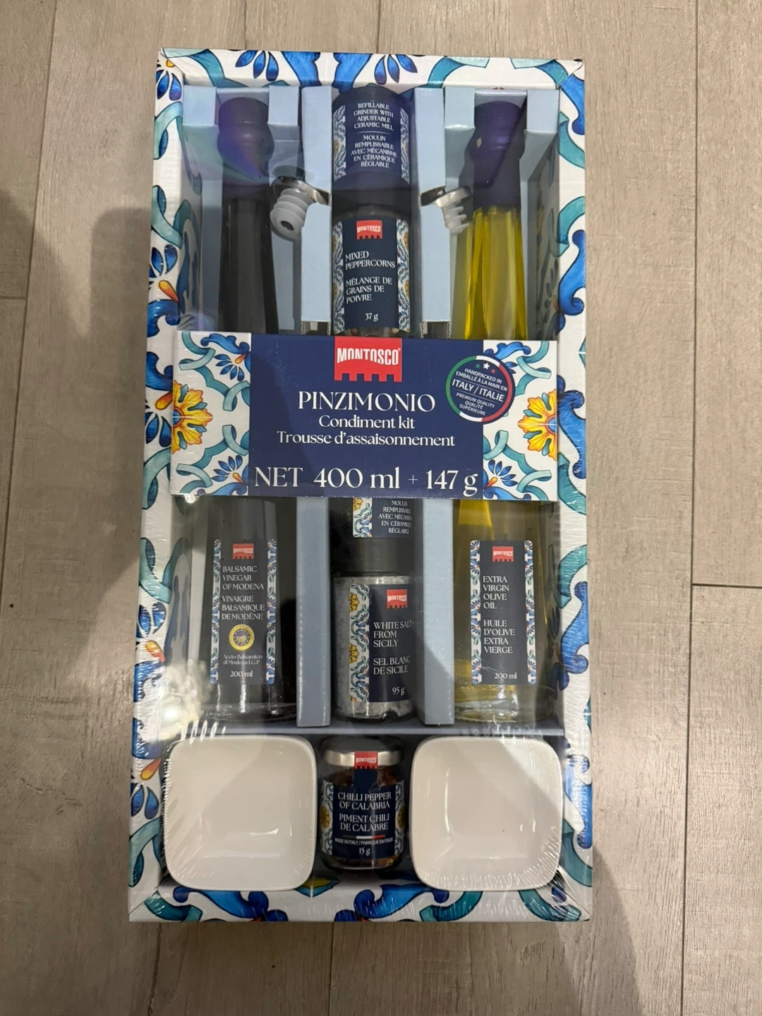 This Montosco Pinzimonio condiment kit includes Extra Virgin Olive Oil and Balsamic Vinegar. It also contains mixed peppercorns, white peppercorns, and crushed chili pepper. The kit comes with two small dipping dishes.
